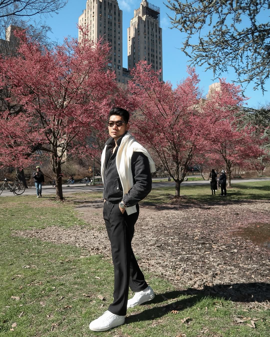 A zip-up jacket layered with a sweater draped over the shoulders, tailored black trousers, and white sneakers feels made for cherry blossom season. The palette is neutral, letting the pink blooms steal the spotlight.