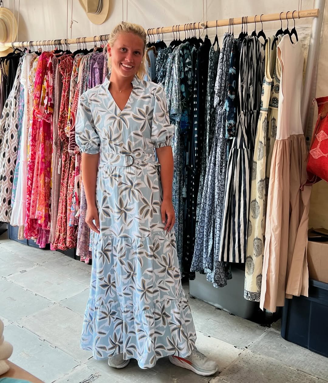 There’s a relaxed charm to this moment that feels straight out of a sunny coastal boutique. The pale blue dress with its soft leaf pattern brings a breezy, vacation ready mood, while the gentle tiered skirt keeps the silhouette playful and light.