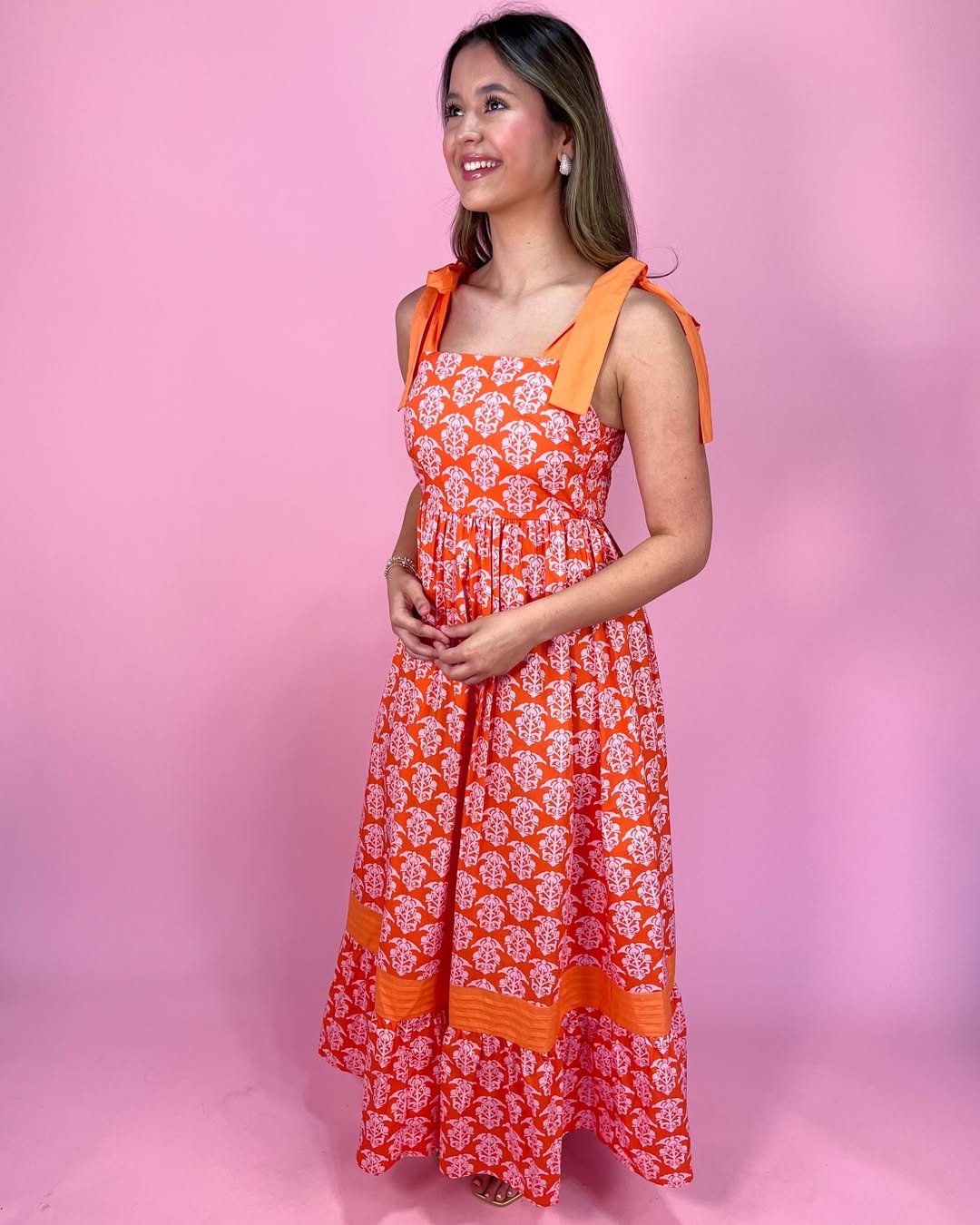 This orange maxi is pure sunshine in dress form. The bold color and charming pattern make it instantly eye-catching, while the bow-tie straps add a playful, youthful detail.