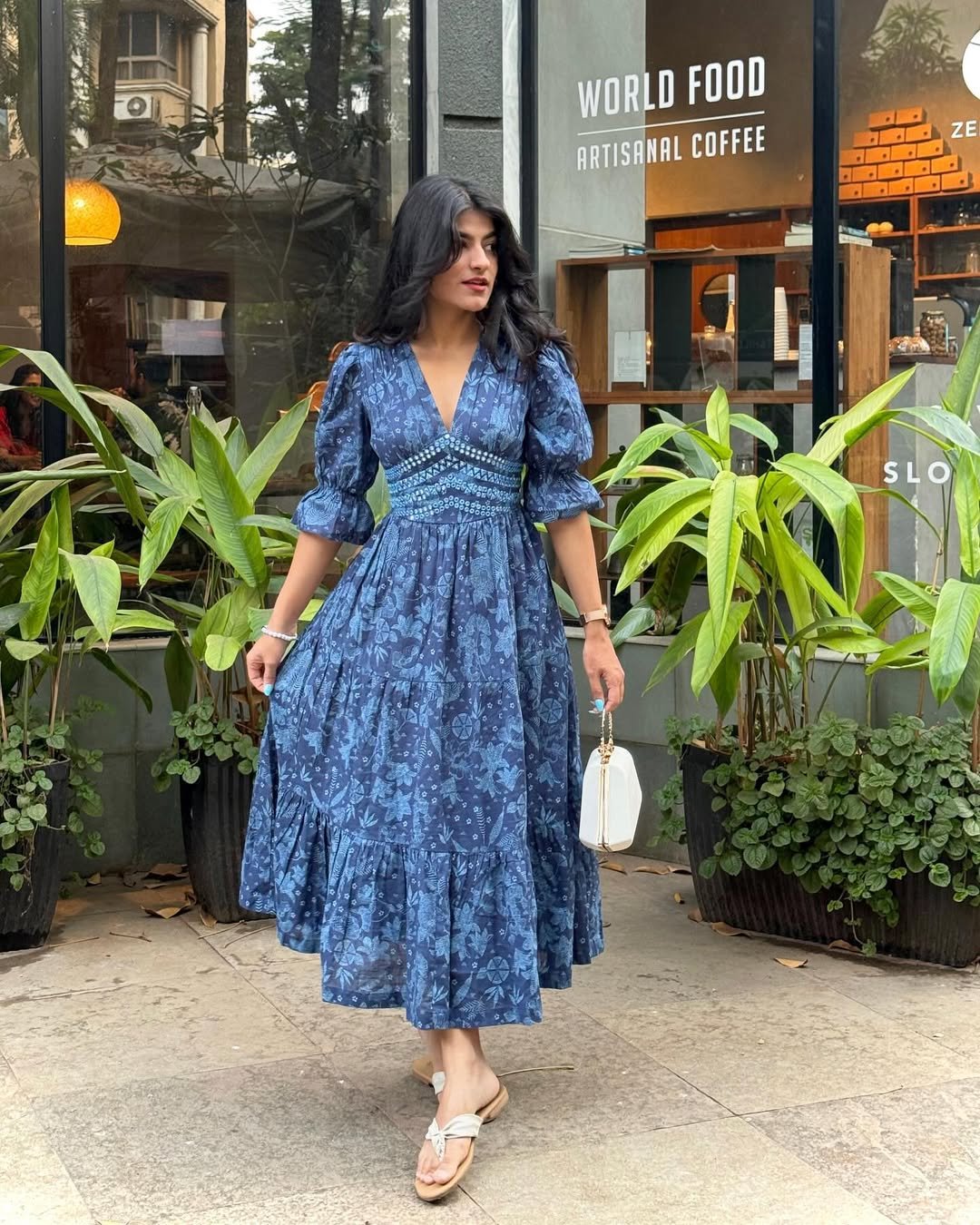 Set against the café backdrop and greenery, the whole scene feels like a slow city afternoon. Add simple flats and a small white bag, and suddenly the outfit feels ready for coffee dates, weekend strolls, and those spontaneous photos you end up loving the most.