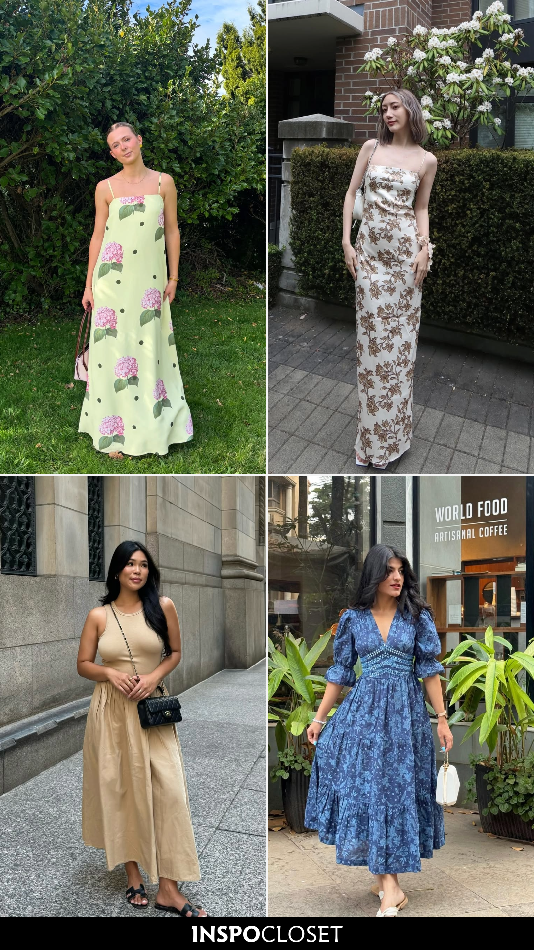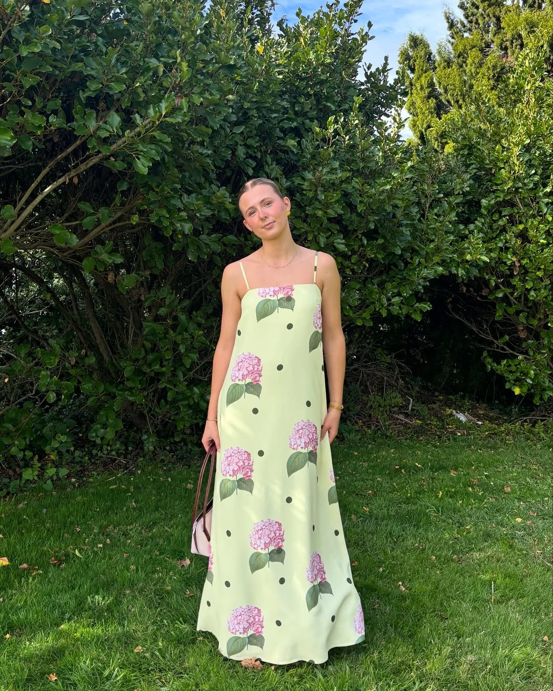 Florals on a maxi dress always work, but this one feels especially fresh. The light green base paired with hydrangea-style prints creates a look that feels soft, summery, and slightly whimsical.