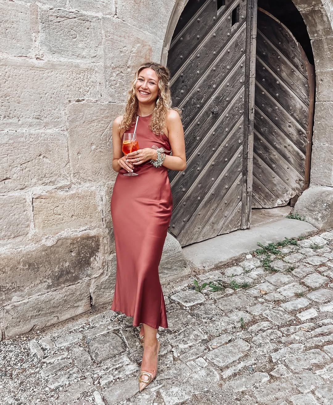 This silky rust-toned dress has that beautiful slip-dress magic—it’s simple, but it looks incredibly luxurious. The way the fabric drapes gives the whole look a soft, fluid elegance.