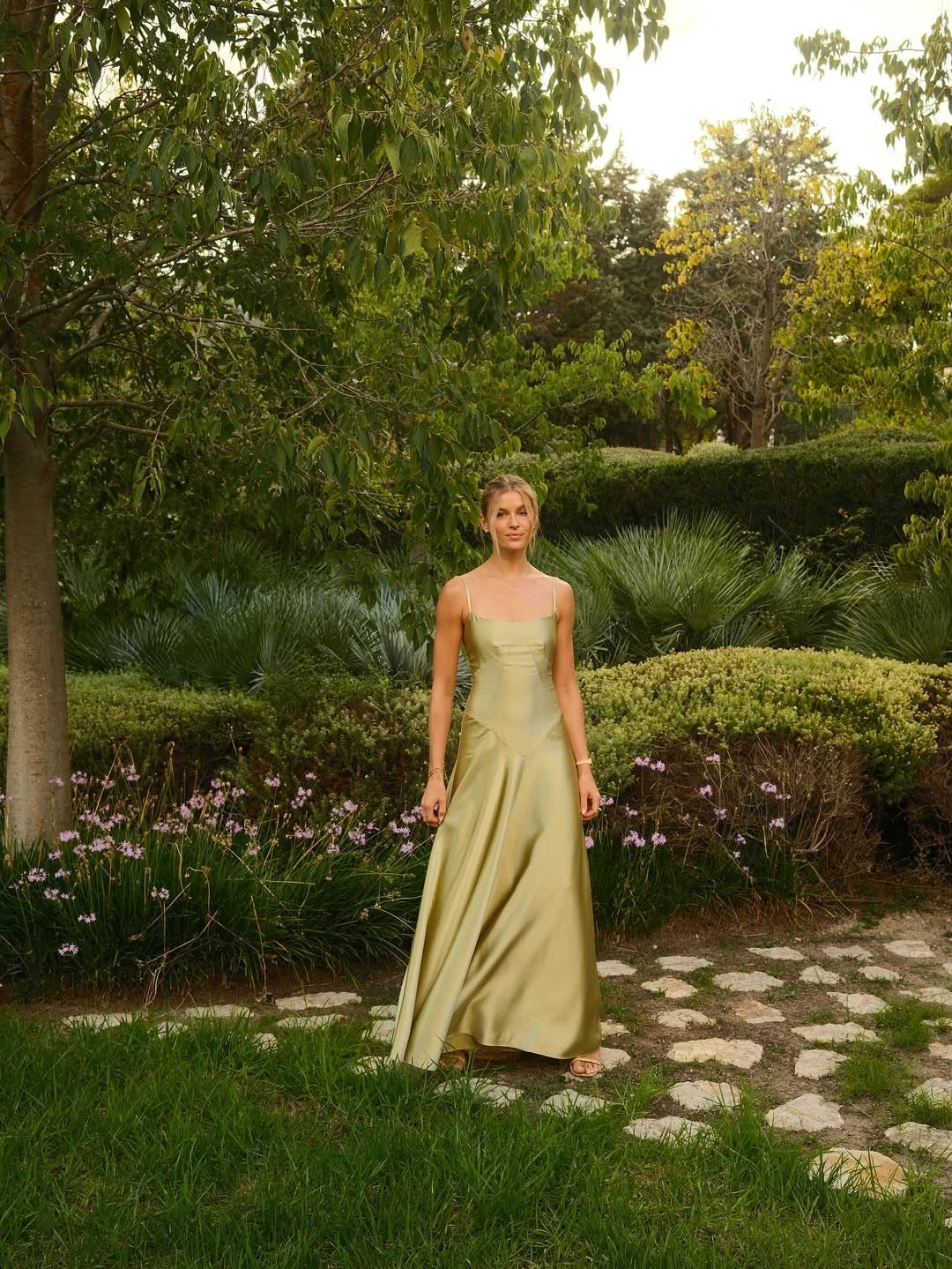 Set against lush greenery, the look feels romantic but not overdone. It’s exactly the kind of dress that works for weddings, outdoor events, or any moment where you want to feel a little extra elegant without trying too hard.