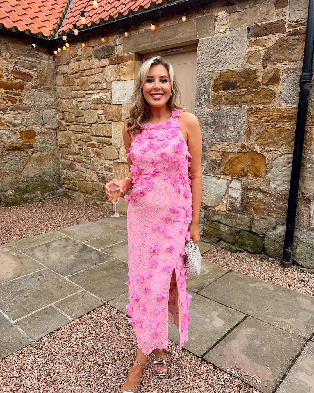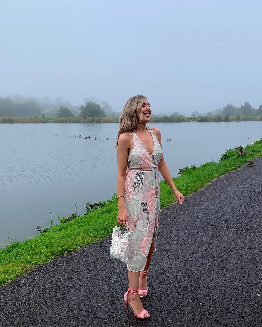 Add the pink heels and that shimmering mini bag, and suddenly the whole outfit feels playful yet polished—perfect for a lakeside celebration or a stylish outdoor party.