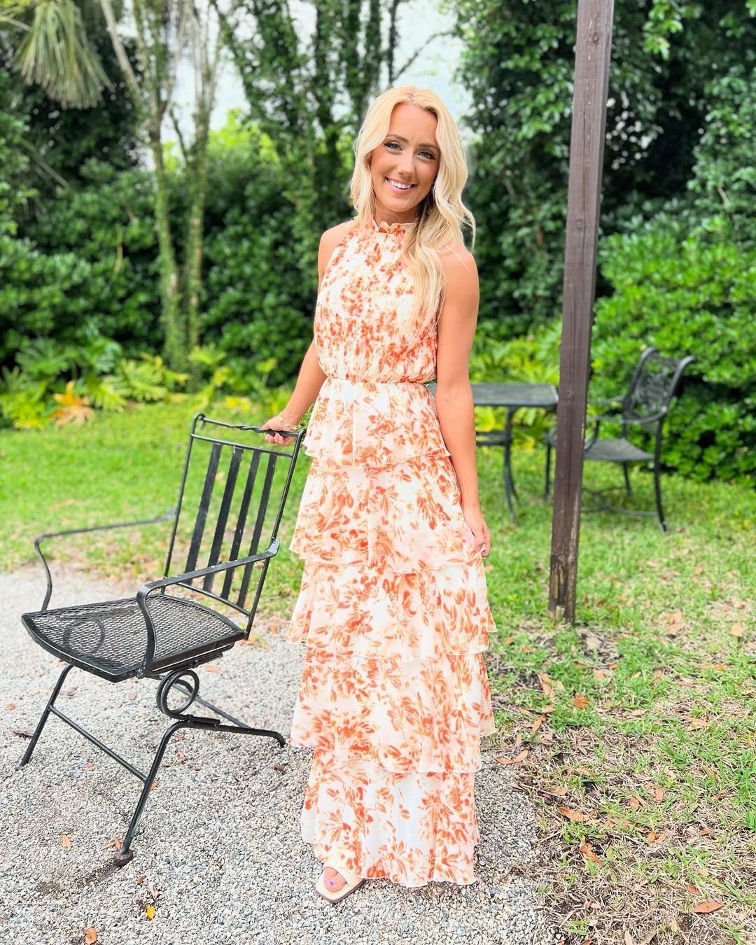 This tiered maxi brings just the right amount of movement and texture. The soft orange floral print combined with layered ruffles gives the dress a slightly dramatic feel without being overwhelming.