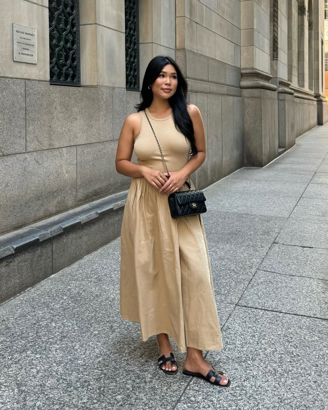 Paired with a small structured bag and flat sandals, the look becomes instantly city-ready. It’s proof that minimal styling can still feel incredibly stylish.