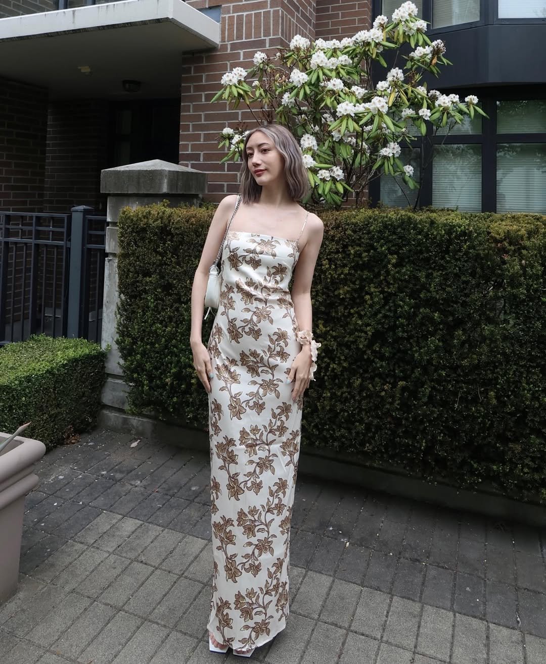 This look is the definition of understated beauty. The slim silhouette paired with soft brown florals gives the dress a calm, refined energy that doesn’t try too hard.