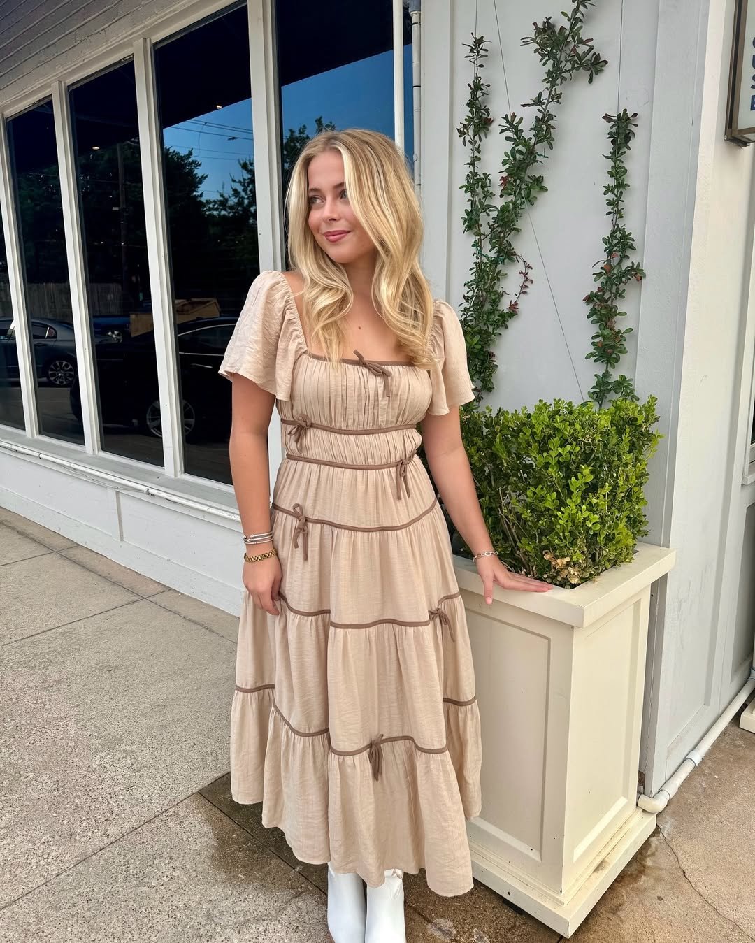 And the vibe here is very “shopping day turned photo moment.” It’s easy, a little flirty, and the kind of dress that looks great whether you’re out with friends or just wandering through your favorite boutiques.