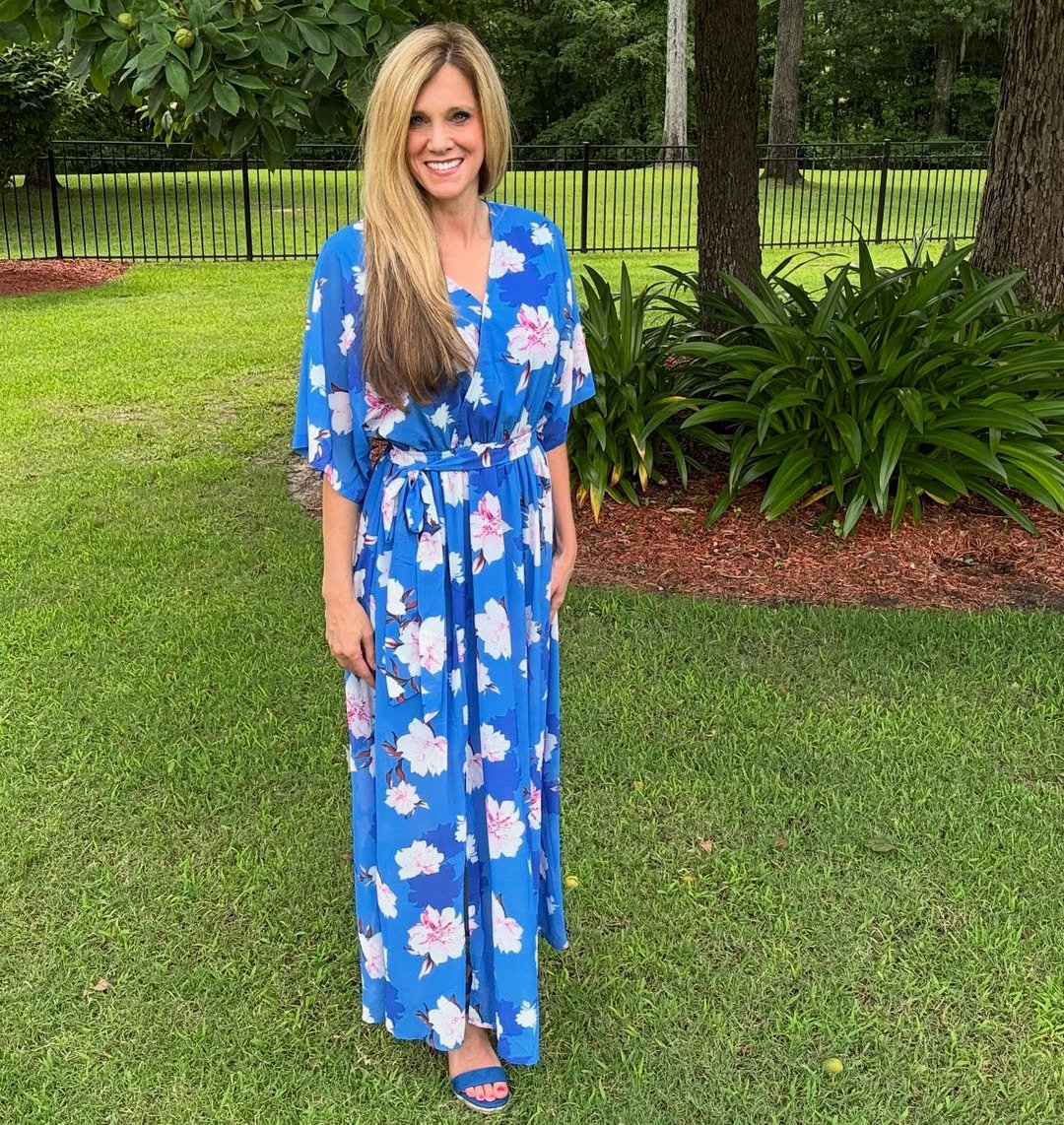 This vibrant blue floral maxi feels like it belongs at a garden party under the warm afternoon sun. The bold blossoms against that rich blue backdrop create a cheerful, classic look that instantly brightens the scene.