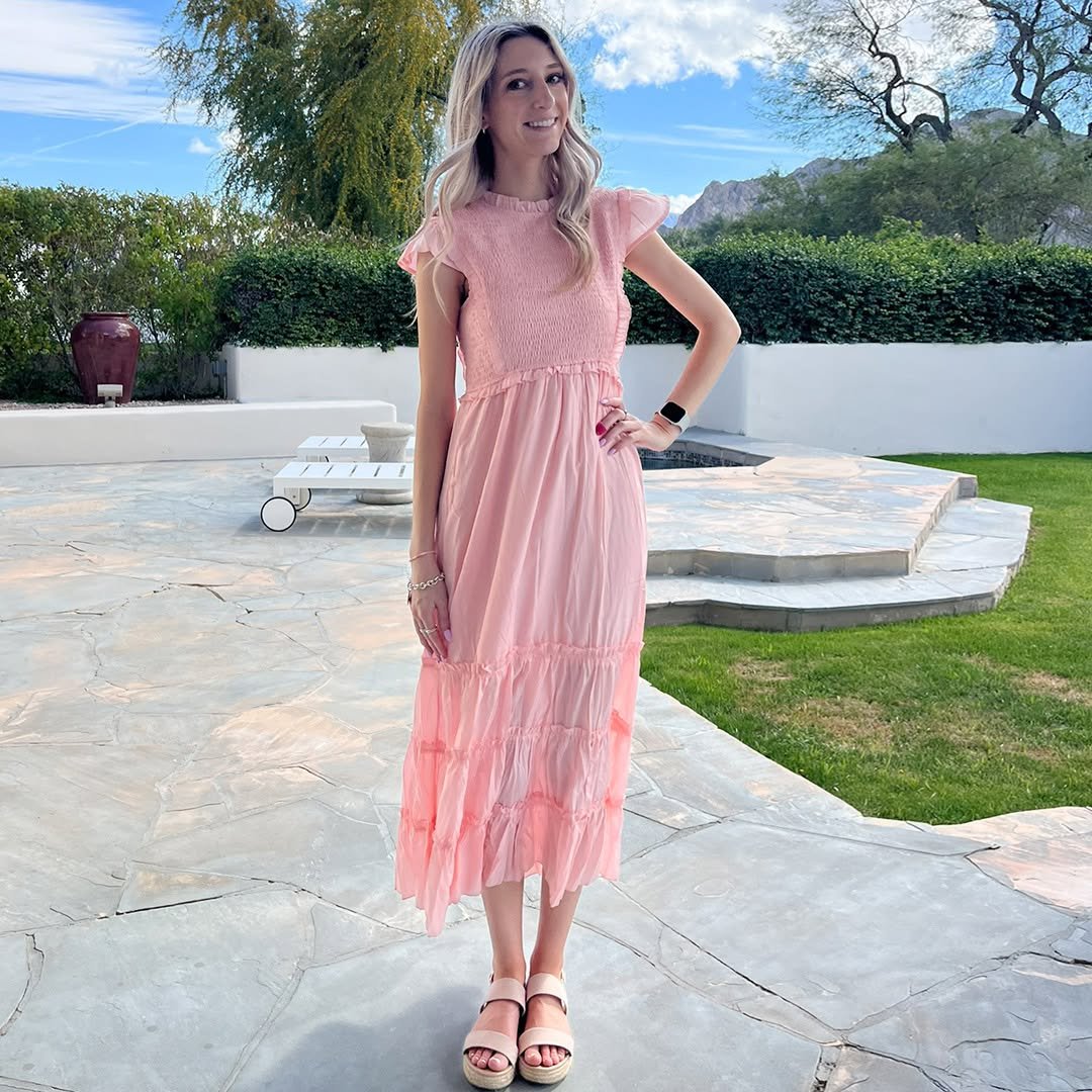 This blush pink dress feels like a warm spring afternoon in outfit form. The ruffled sleeves and tiered skirt bring a gentle romantic touch that feels light and playful.