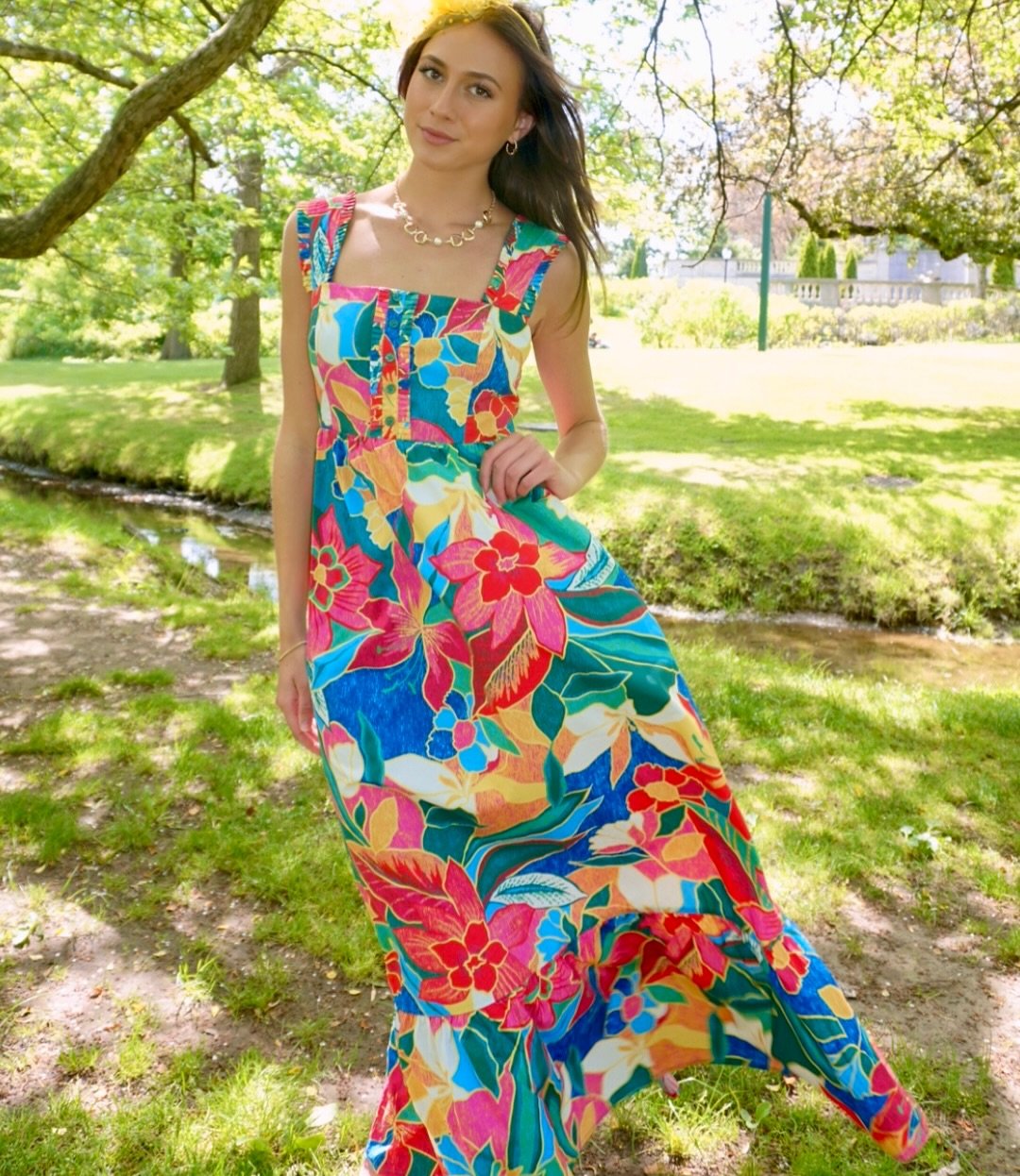 This dress is pure color therapy. The bold floral print pops beautifully against the lush outdoor setting, creating a look that feels joyful and full of life.