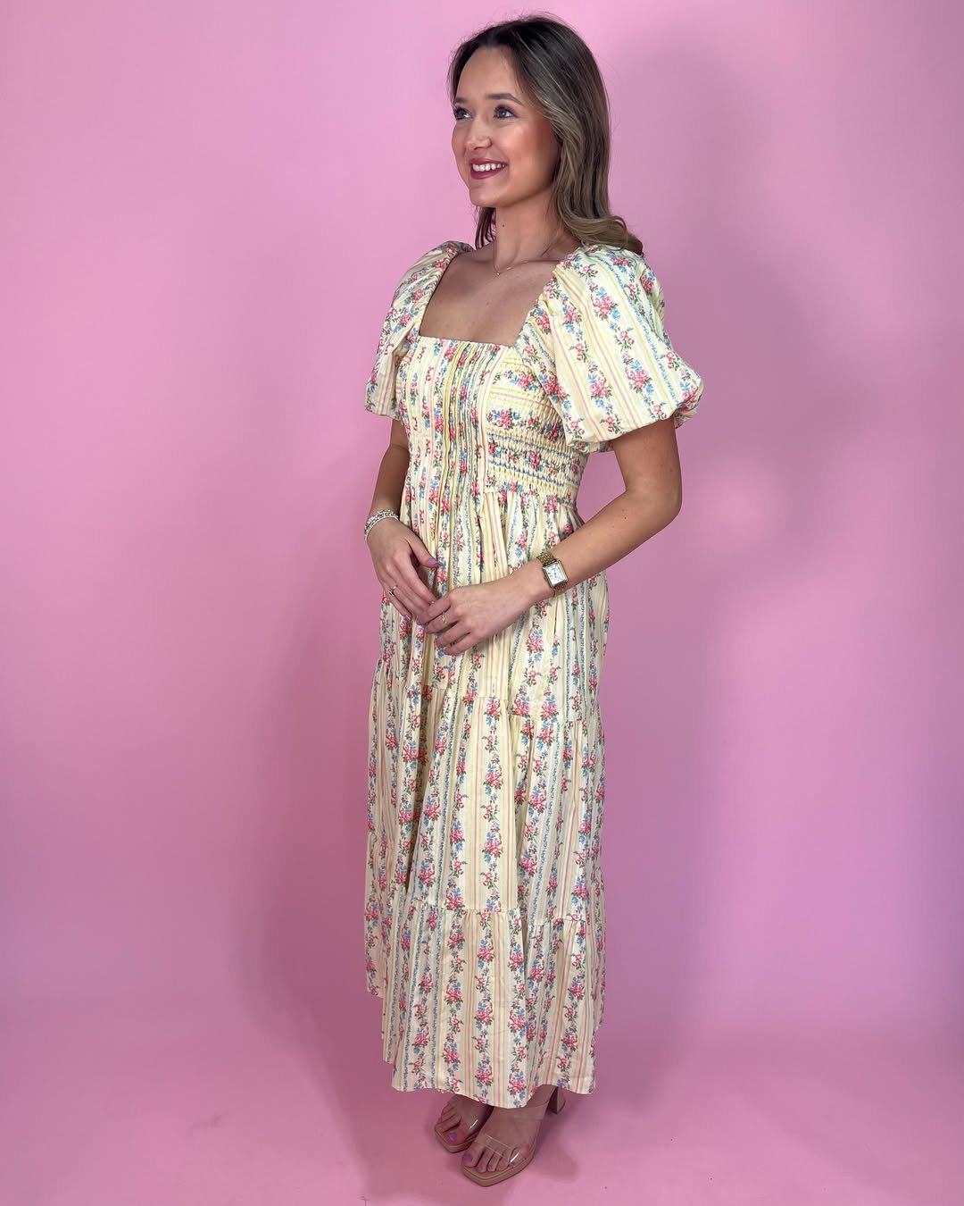 This floral maxi feels like a soft nod to vintage fashion. The puff sleeves and smocked bodice create that flattering, comfortable fit that makes dresses like this so easy to wear all day.