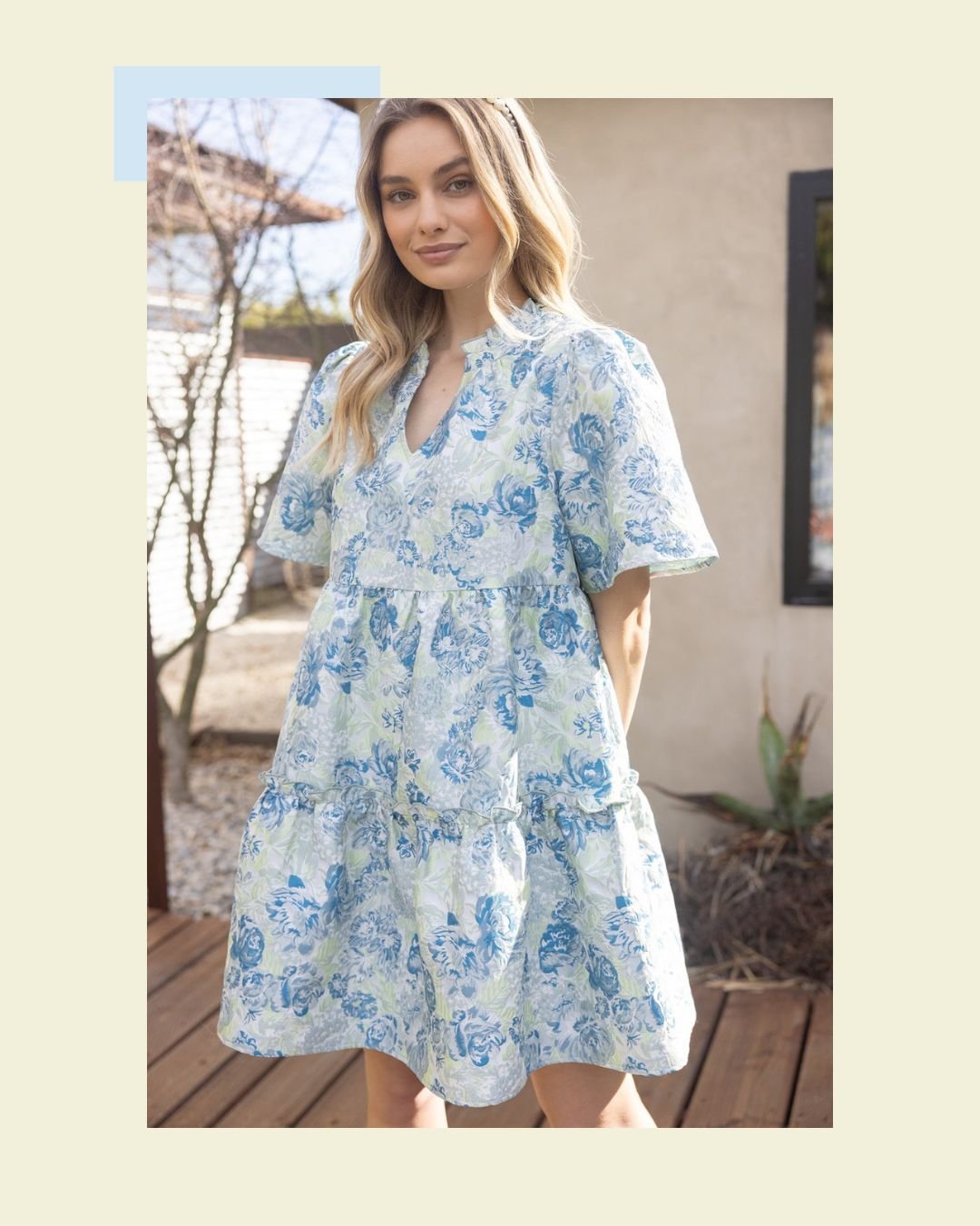There’s something effortlessly dreamy about this soft blue floral dress. The tiered silhouette and airy sleeves give it that easy movement that feels made for slow spring afternoons.