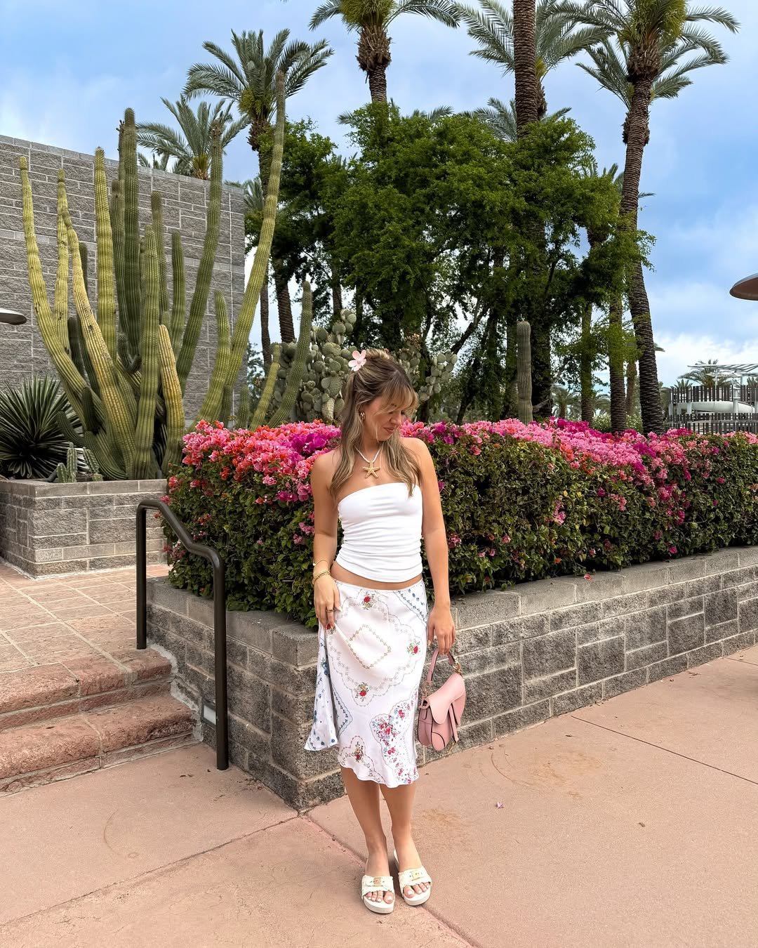 There’s something about this outfit that feels perfectly suited for warm desert afternoons. A simple white tube top keeps things light and clean, while the delicate printed midi skirt adds just enough pattern to keep it interesting.