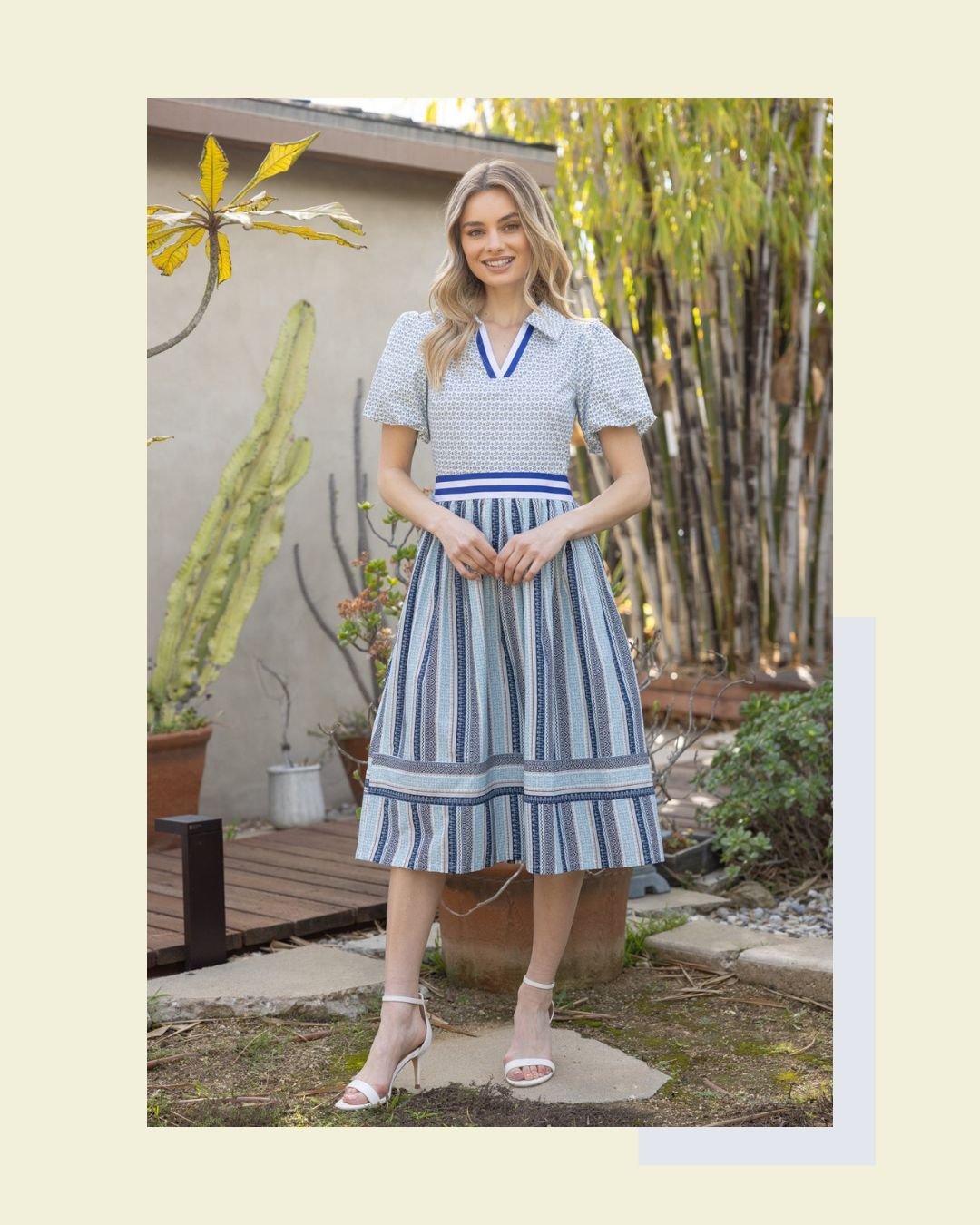This dress carries a quiet elegance that feels timeless. The delicate blue pattern paired with the structured bodice creates a refined silhouette that feels polished without being overly formal.