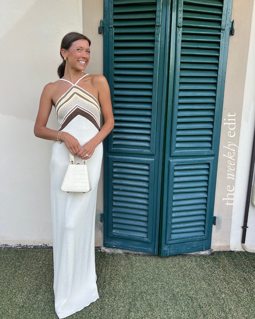 Paired with gold jewelry and a structured white bag, the whole outfit reads quiet luxury. The kind of look that feels perfectly at home near sun-washed shutters and cobblestone streets.