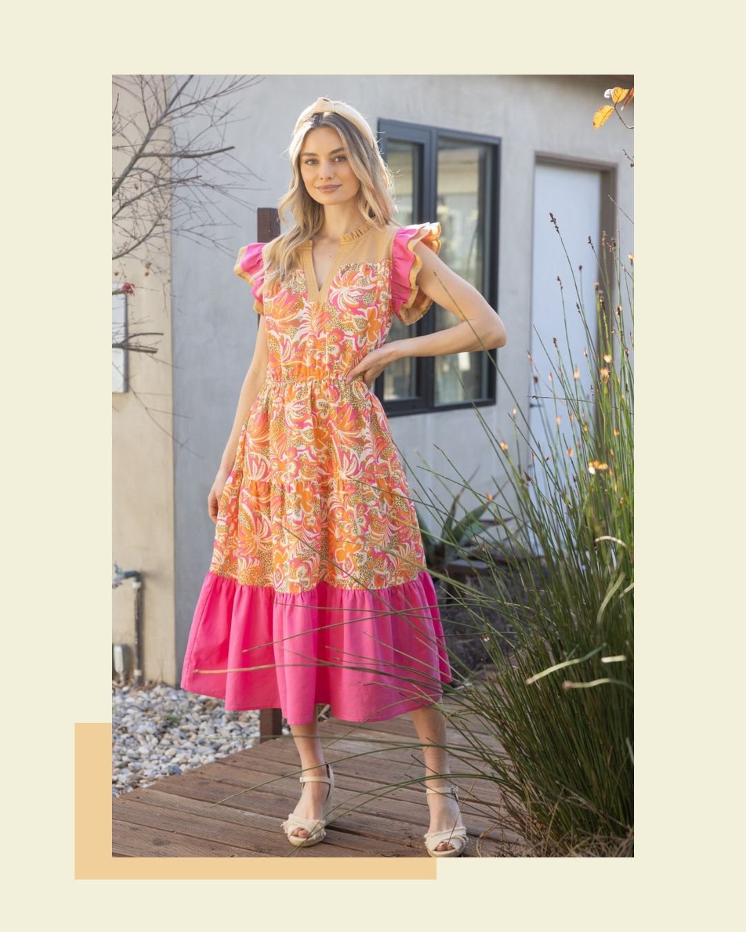 This dress leans into bold color in the best way. The swirling paisley pattern mixes warm coral, soft gold, and vibrant pink tones that instantly bring energy to the whole look.