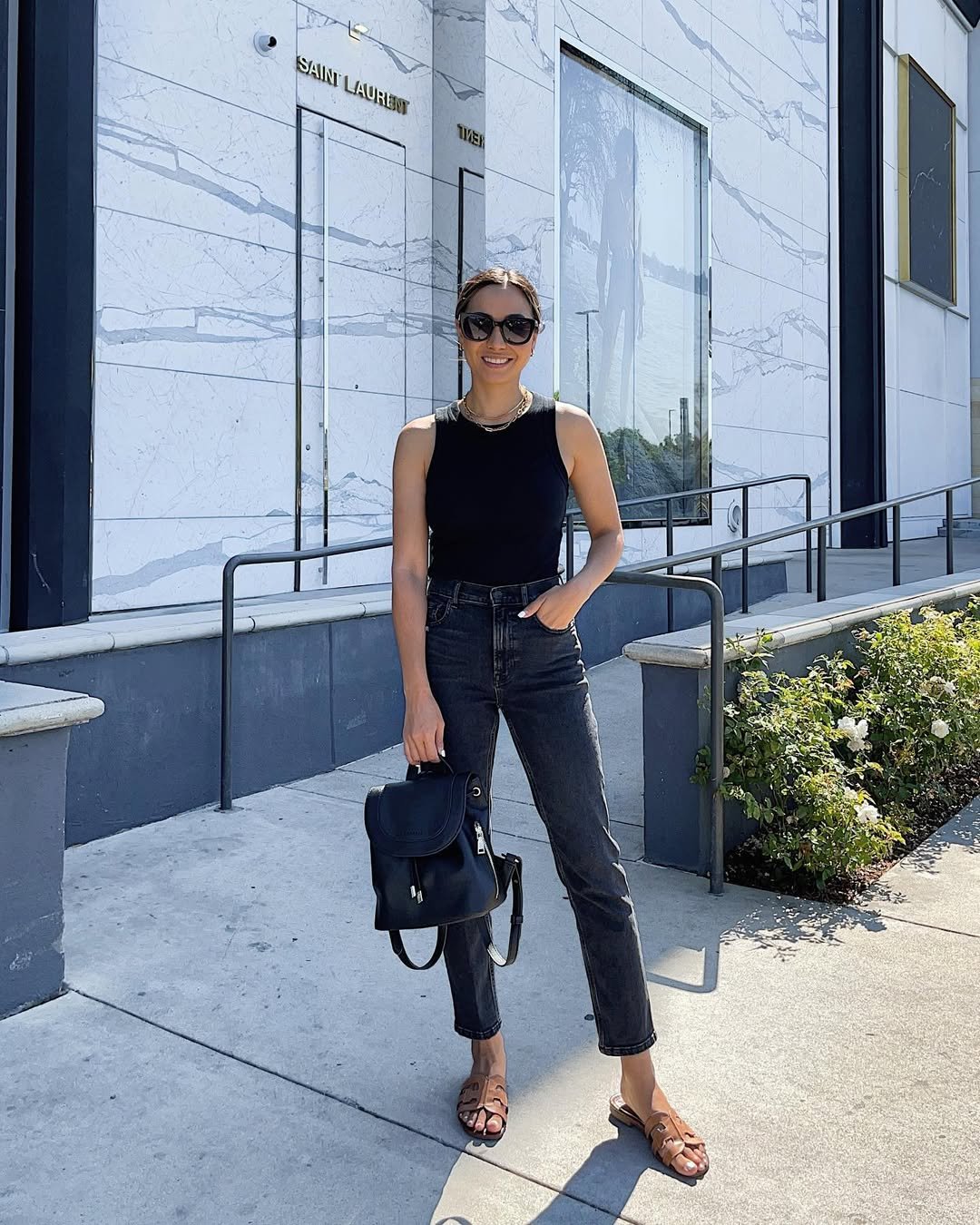 A fitted black tank tucked into high-rise charcoal jeans is as classic as it gets. The silhouette is clean, sharp, and flattering without trying too hard.
