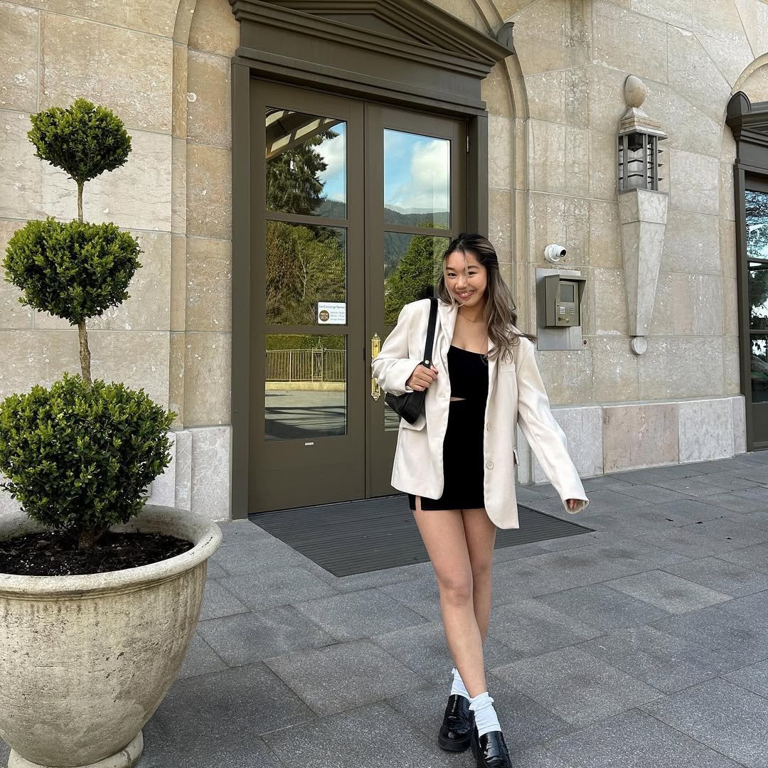 An oversized beige blazer over a black mini dress feels playful yet refined. The white socks with chunky loafers give it that slight preppy twist that makes it interesting.