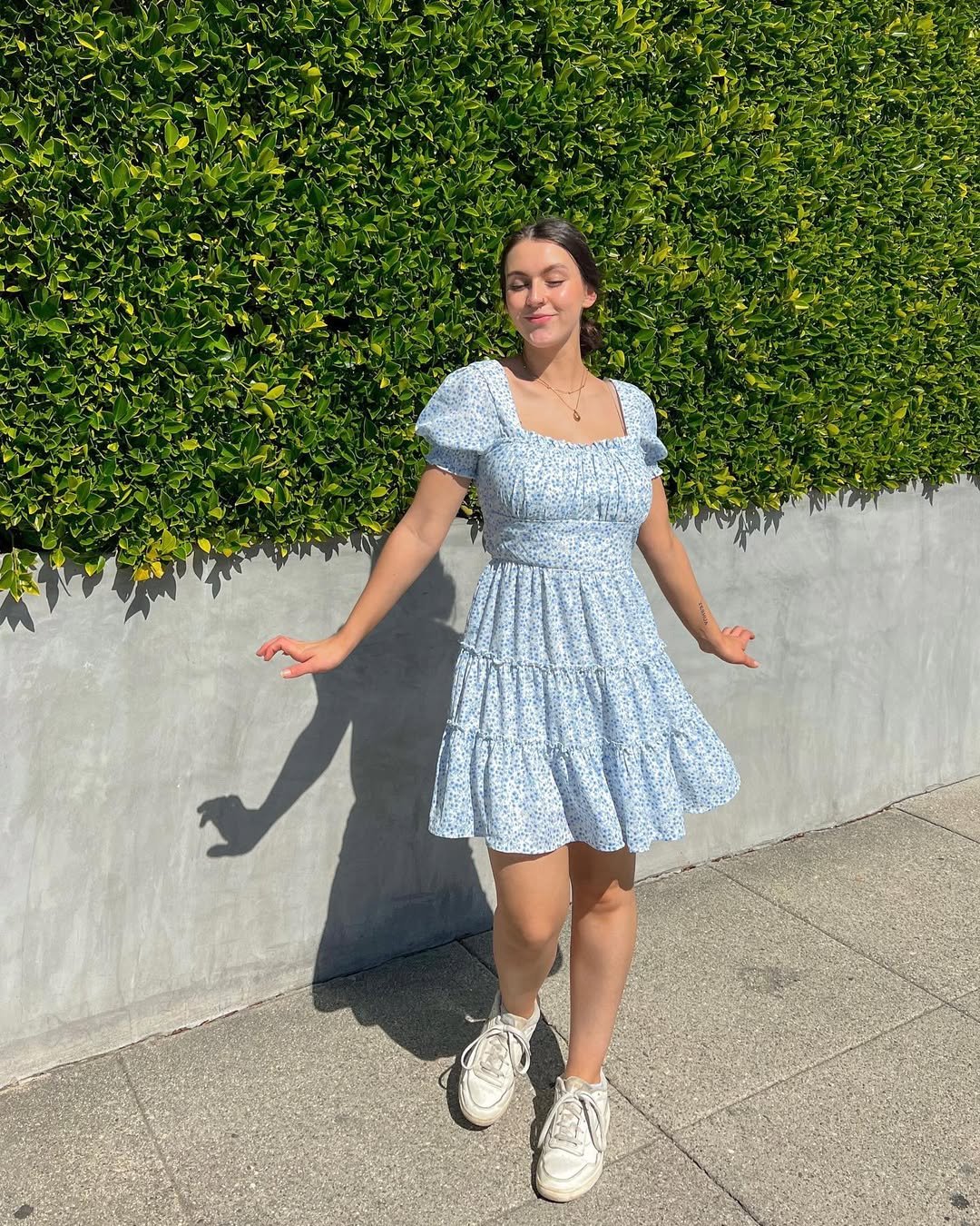A light blue tiered dress with subtle florals is the definition of spring sweetness. Paired with chunky white sneakers, it feels grounded and wearable, not overly dressed up.