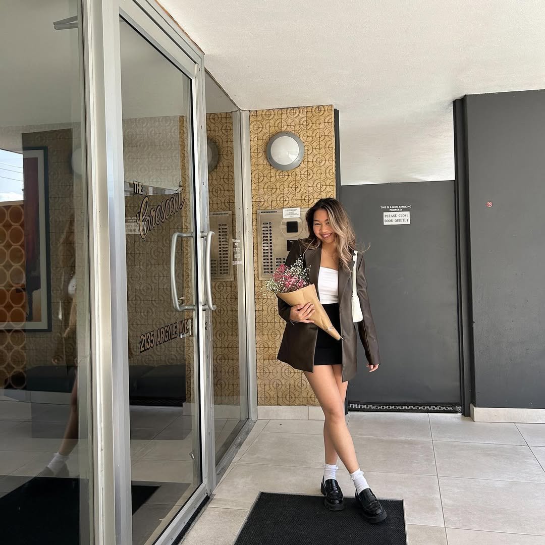 There’s something undeniably charming about a tailored brown blazer styled with a simple black mini and a bouquet in hand. It feels like a city-girl-on-her-way-to-brunch moment, effortless but thoughtful.