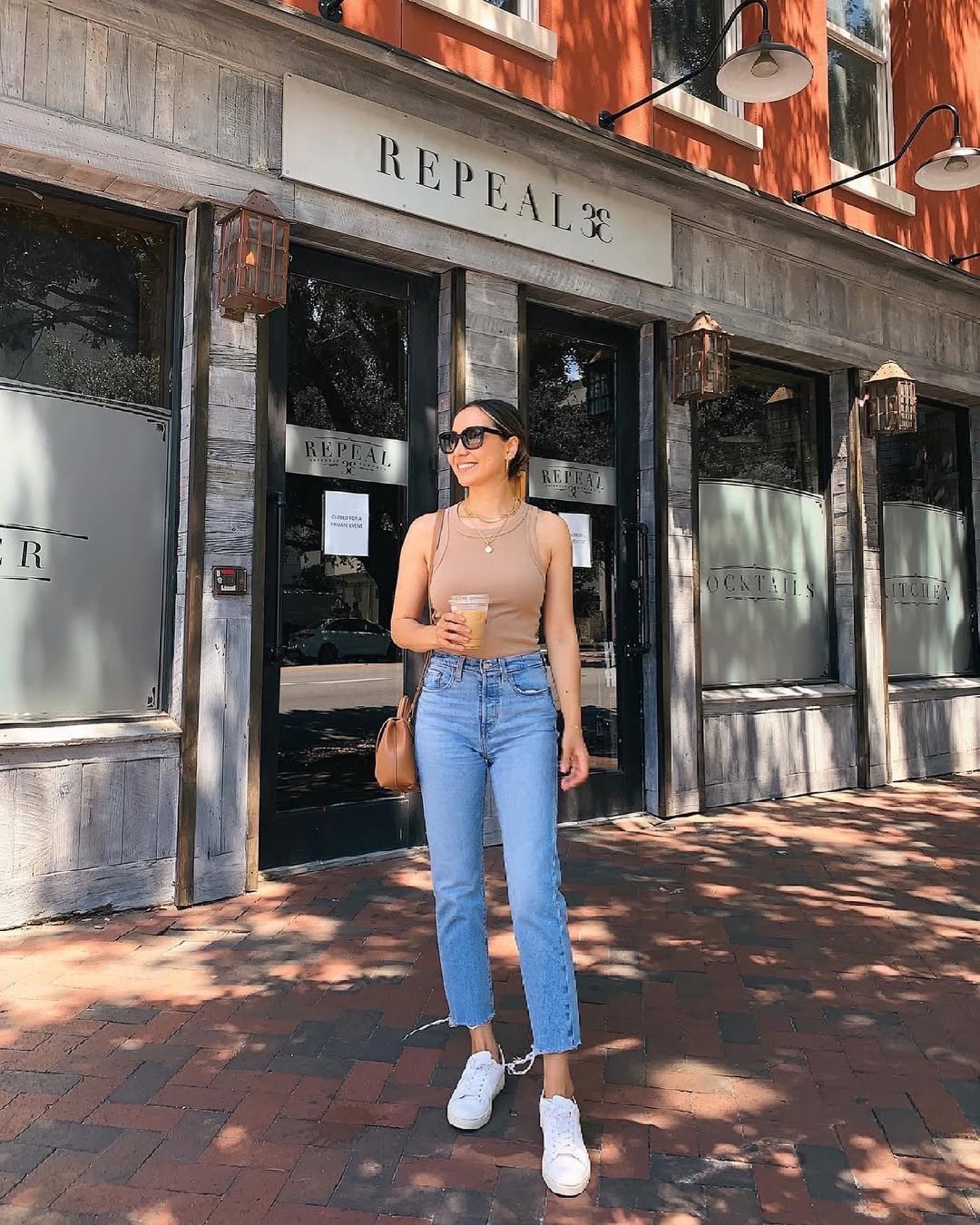 A fitted taupe tank and straight-leg denim is one of those forever combinations. Clean lines, simple shape, and white sneakers that make the whole thing feel fresh.