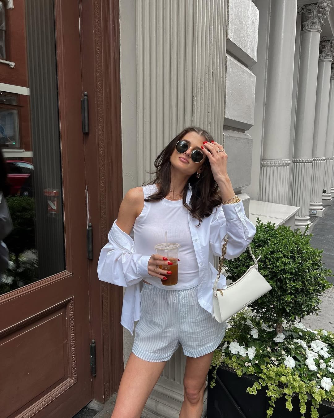 An oversized white button-down slipping off the shoulder always feels a little undone in the best way. Paired with a fitted tank and breezy striped shorts, this look leans into that downtown-cool aesthetic without trying too hard. Add black round sunnies and a sleek white bag, and suddenly it’s editorial.