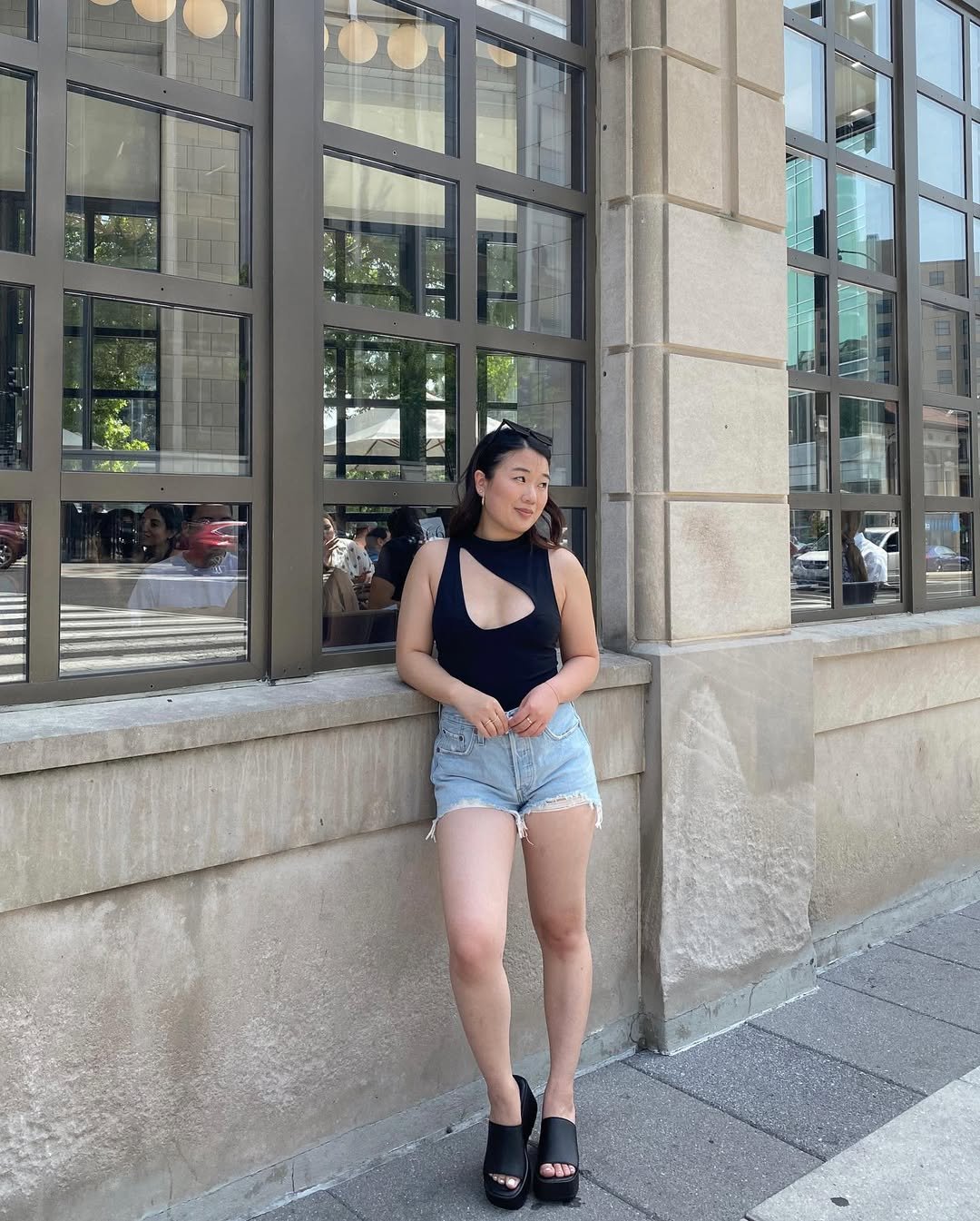 A black asymmetrical cut-out top with high-waisted denim shorts feels bold but still wearable. The silhouette is clean, and the chunky black slides give it that modern edge.