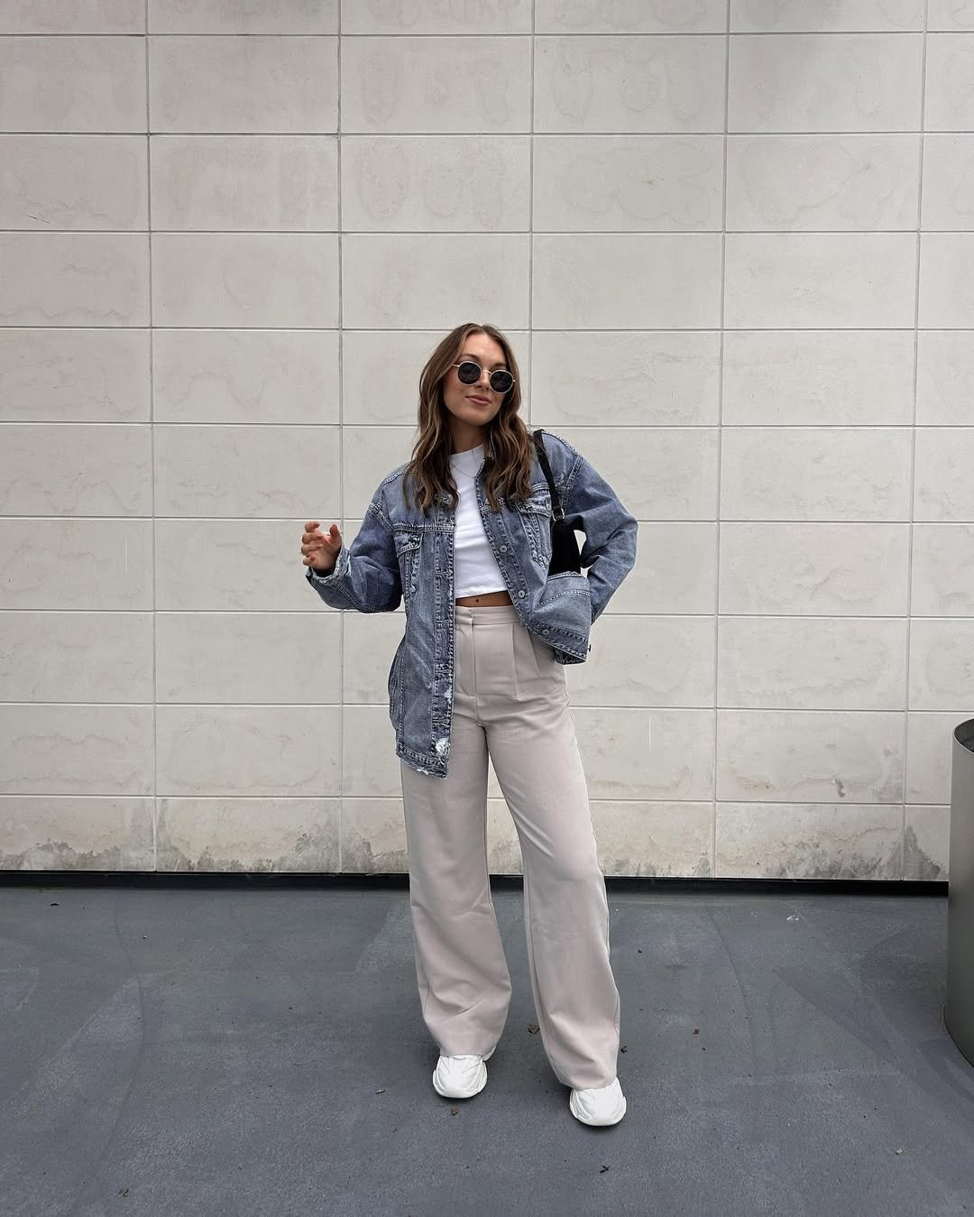 This is such a cool mix of structured and relaxed. The oversized denim jacket layered over a cropped white tee brings that street-style energy, while the tailored beige trousers keep it polished.