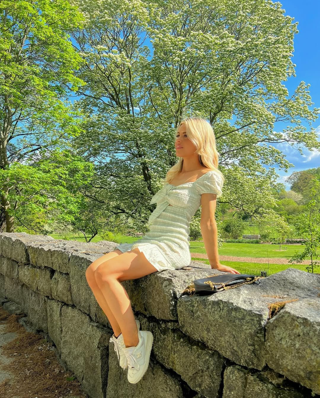 A soft white mini dress with delicate ruching and puff sleeves feels like a breath of fresh air. Styled with simple white sneakers and a tiny shoulder bag, it’s romantic but still easy enough for a park stroll.
