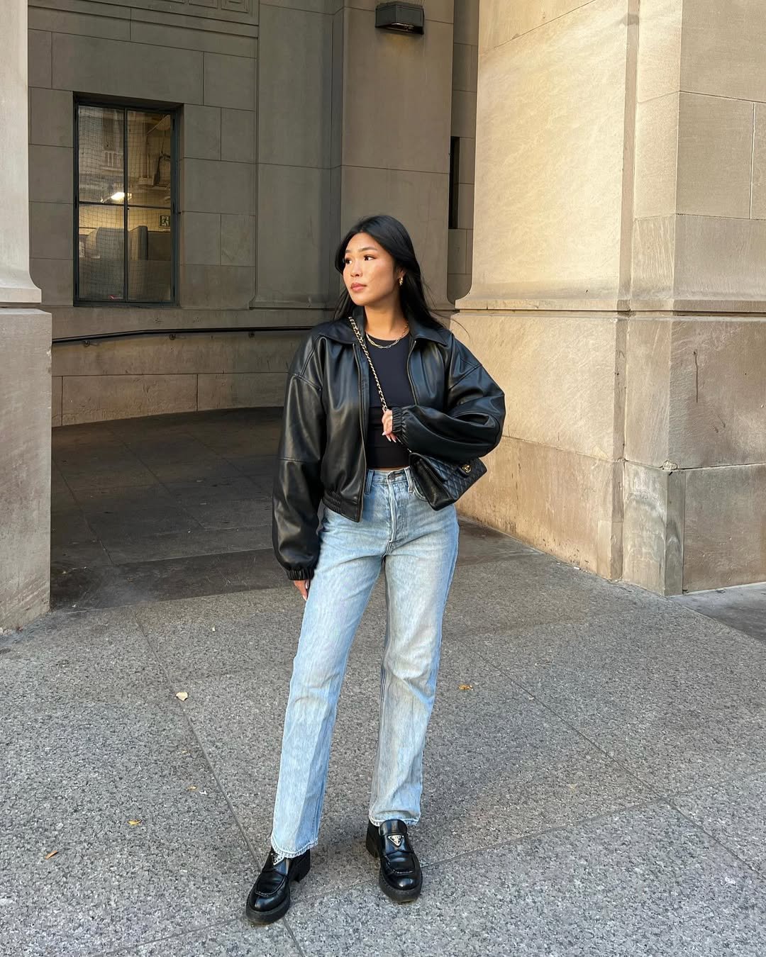 Nothing says cool spring layer like a black leather jacket over a simple black top and light-wash jeans. The loafers add polish, while the cropped silhouette keeps it fresh for the season.