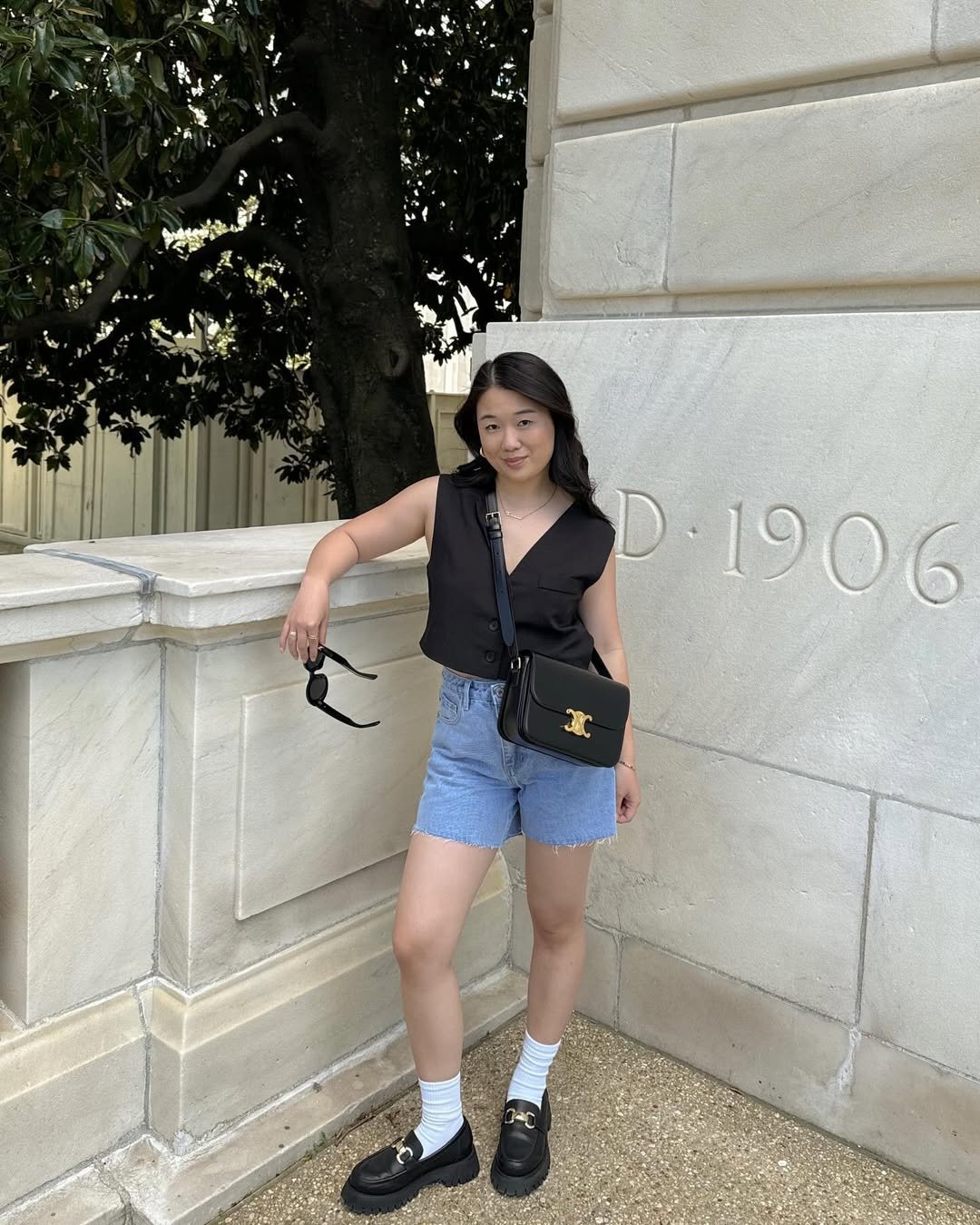 A sleeveless black vest tucked into light-wash denim shorts feels tailored yet relaxed. The gold hardware on the structured black bag adds a subtle luxe touch that pulls everything together.