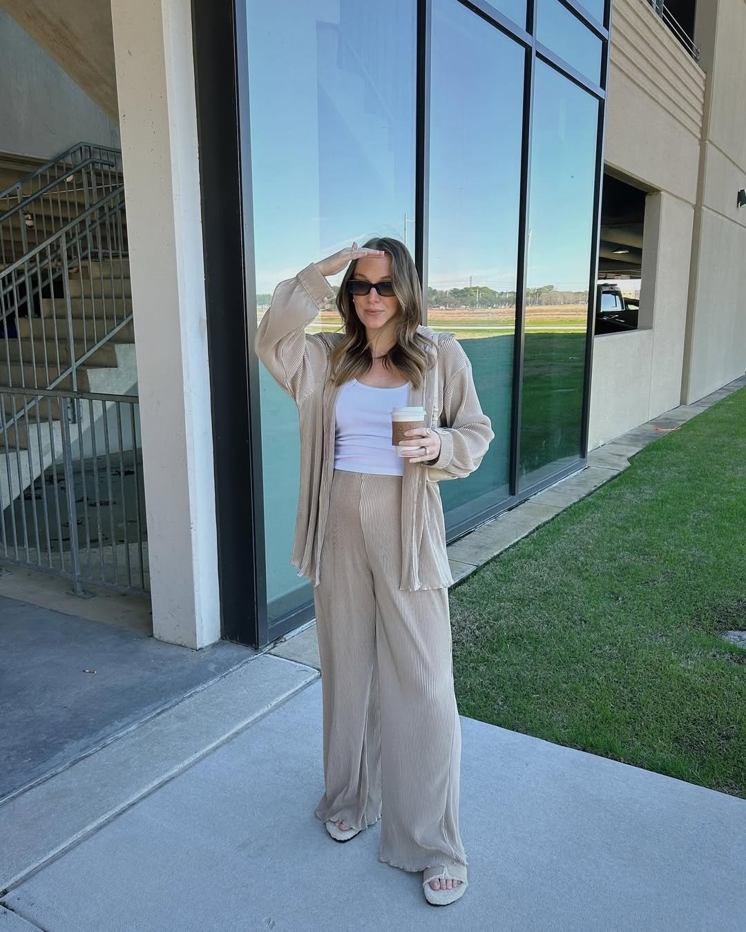 There’s something so satisfying about soft beige tones styled this cleanly. The ribbed trousers and flowing layer move beautifully, especially against a modern glass backdrop.