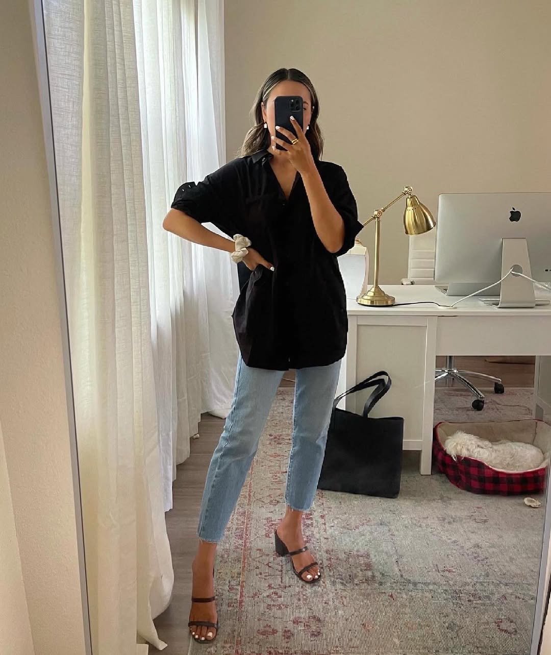 An oversized black button-down over light-wash jeans always feels a little Parisian. Rolled sleeves, a scrunchie at the wrist, and sleek heeled sandals give it that effortless polish.