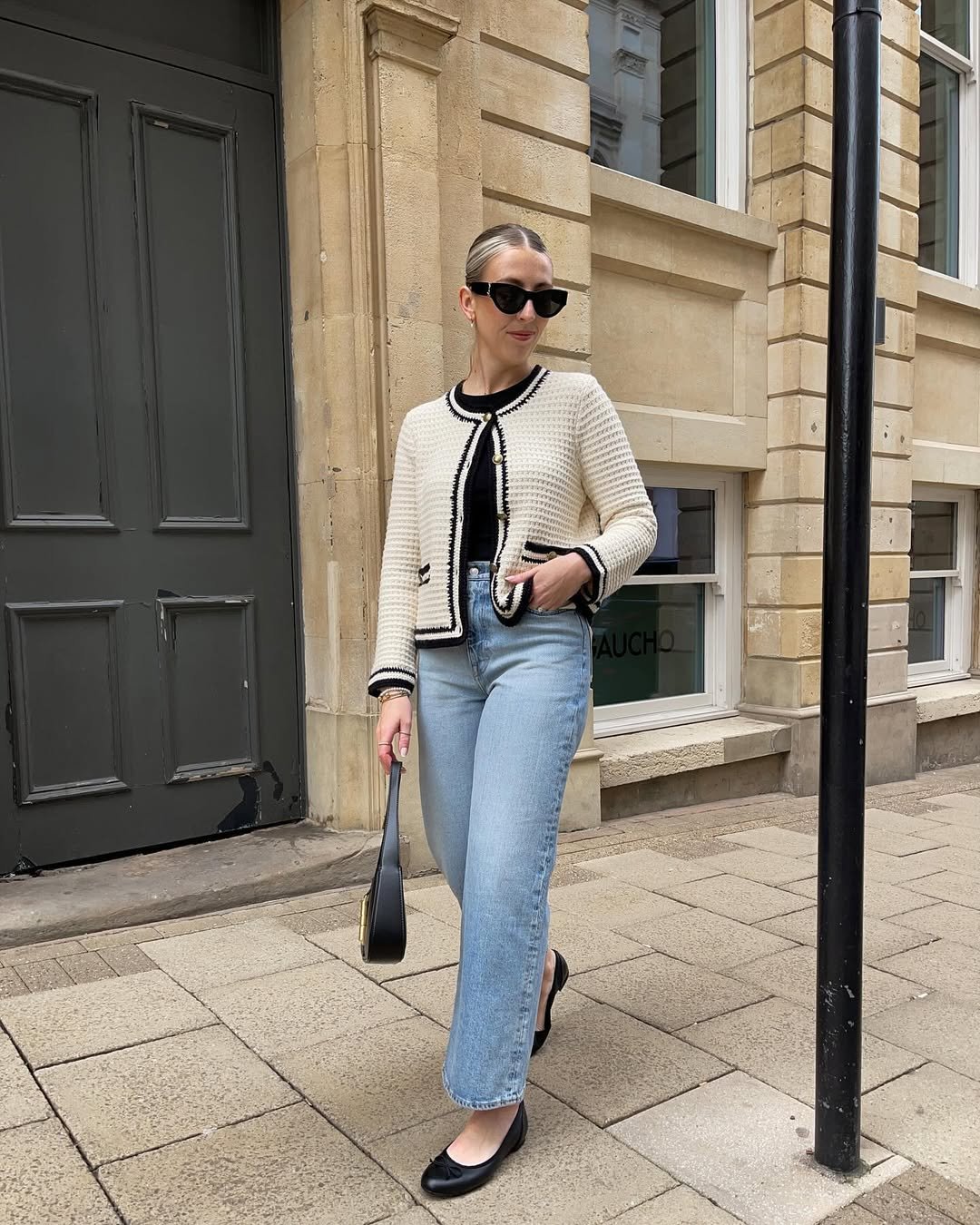 There’s something about a cream cardigan with black trim that just feels like spring in the city. Paired with light-wash straight-leg jeans and classic black ballet flats, this look whispers effortless instead of trying too hard. The sleek bun and sharp sunglasses seal the deal, polished but not precious.