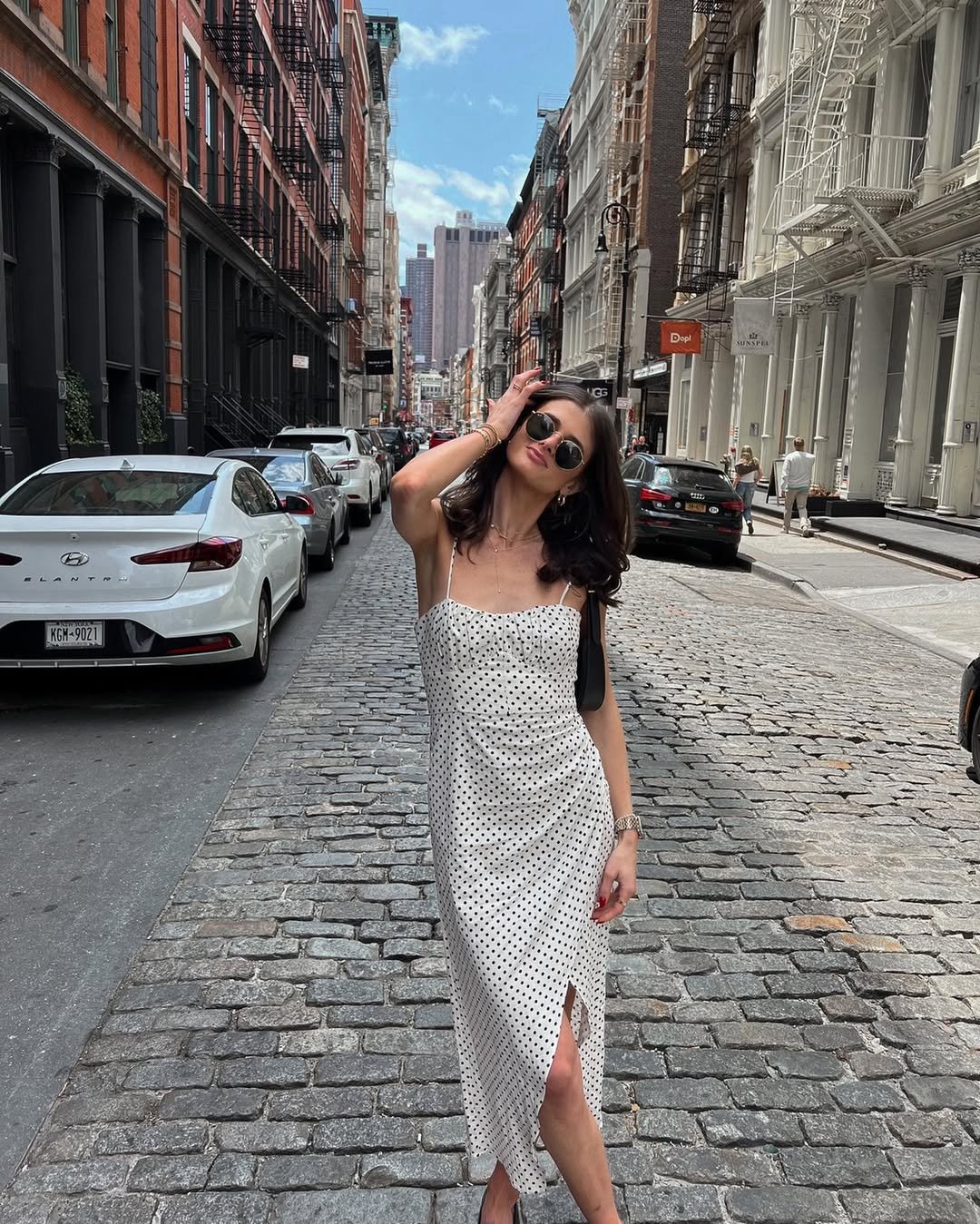 A fitted polka dot midi dress on a cobblestone street just feels right. The silhouette hugs in all the right places, and that subtle slit adds movement without being over the top. Black shoulder bag, minimal jewelry, effortless waves, done.