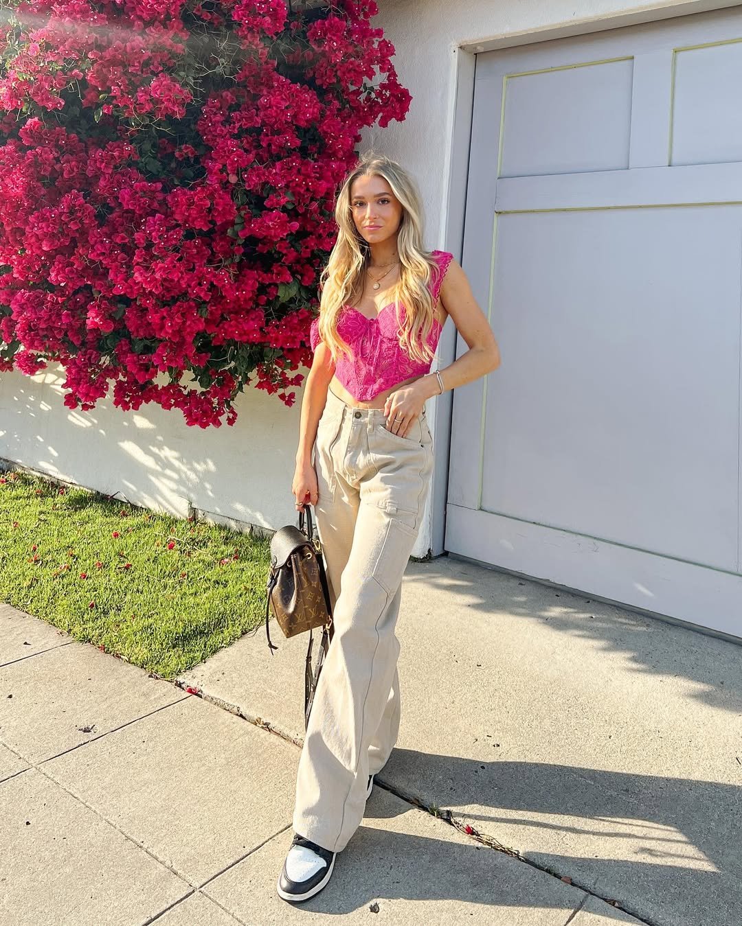 Spring is the perfect excuse for a bold top, and this vibrant pink corset-style piece feels playful without being over the top. Paired with relaxed beige cargo pants and sporty sneakers, it strikes that cool balance between feminine and off-duty.