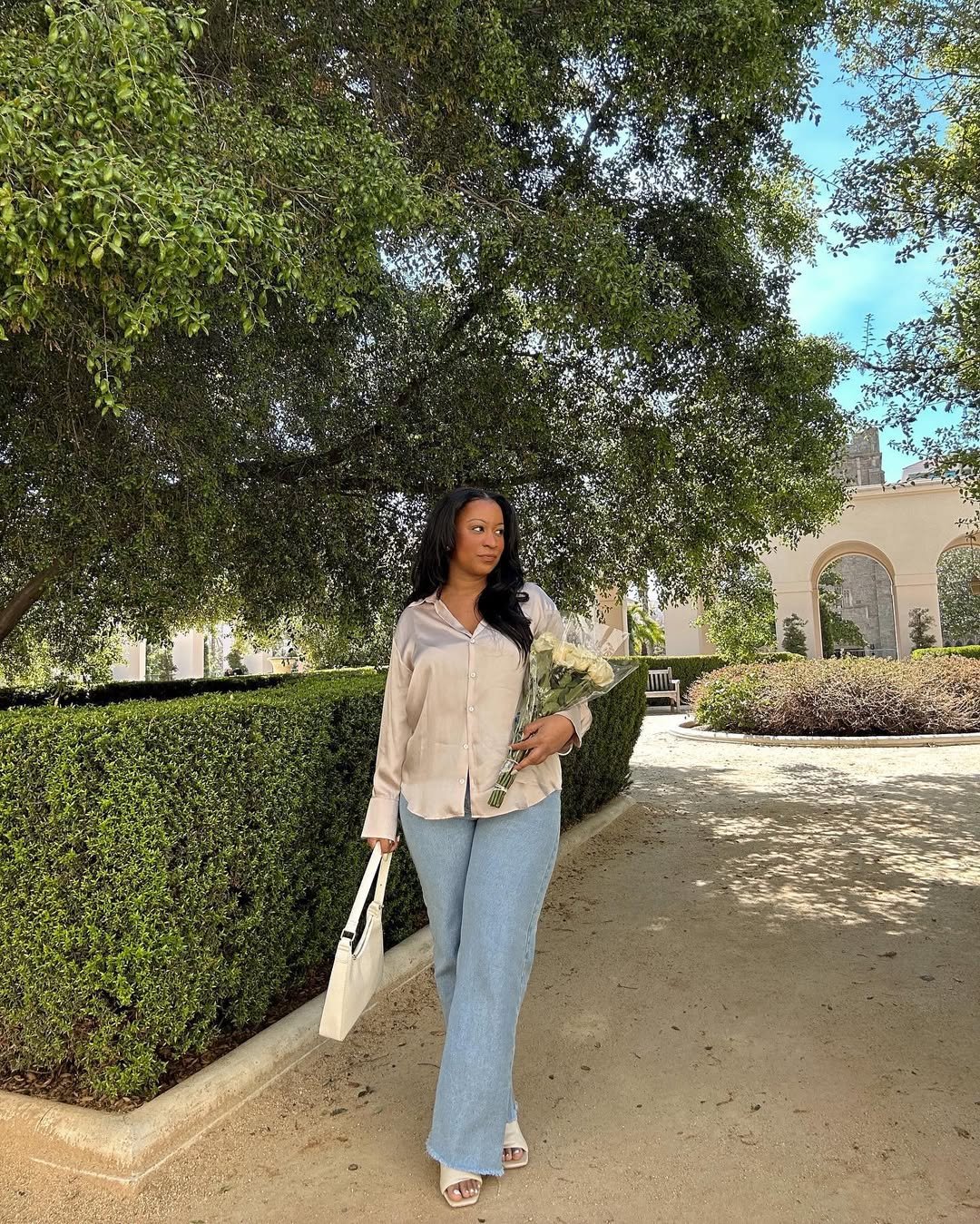 A silky champagne blouse paired with light-wash flares feels soft yet elevated. The fabric catches the light so beautifully, especially against manicured hedges and sunlit stone arches. It’s romantic without feeling delicate.
