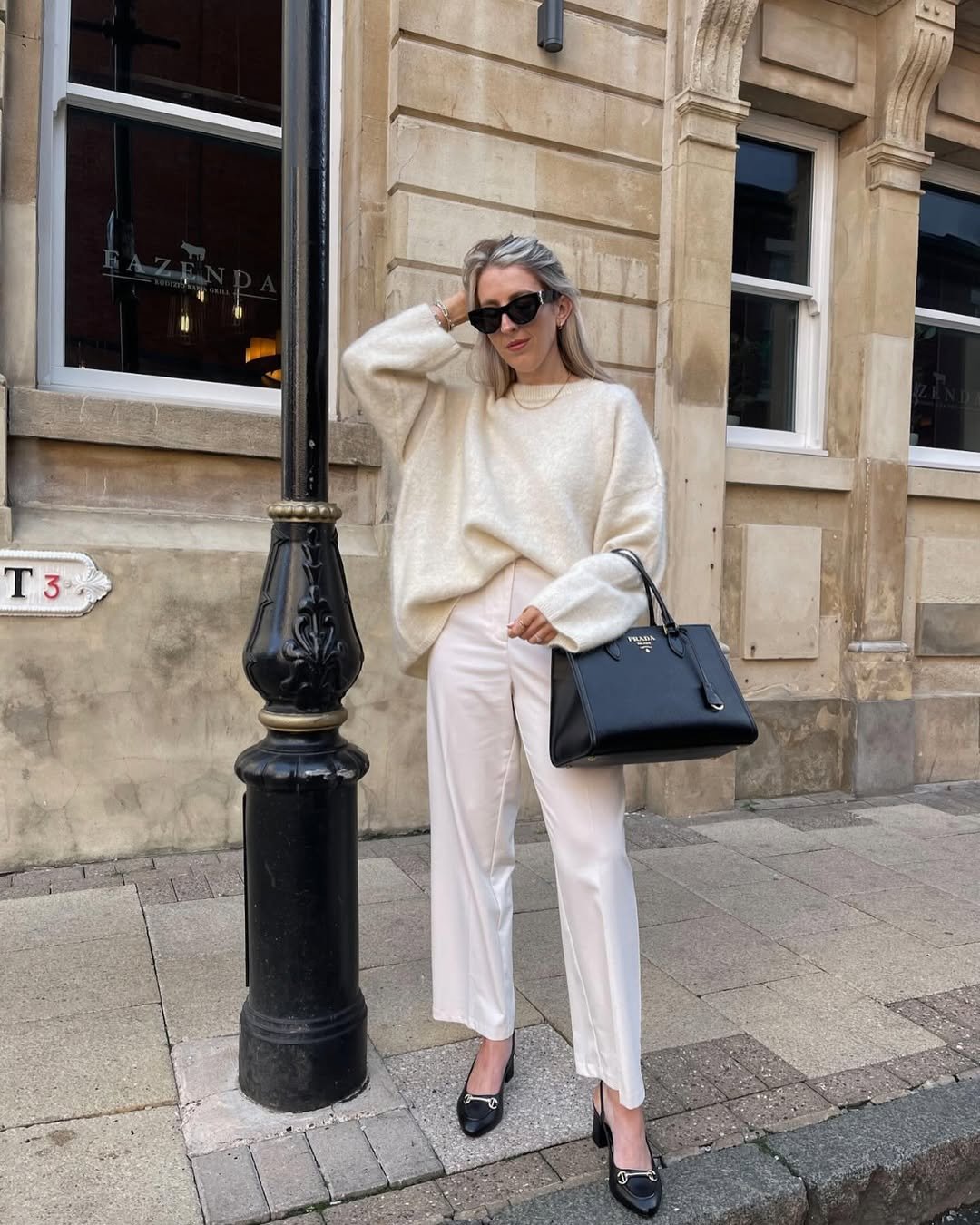 An oversized cream sweater tucked into tailored ivory trousers feels equal parts cozy and composed. Add black loafers and a structured black handbag, and suddenly it’s giving quiet luxury with zero effort.