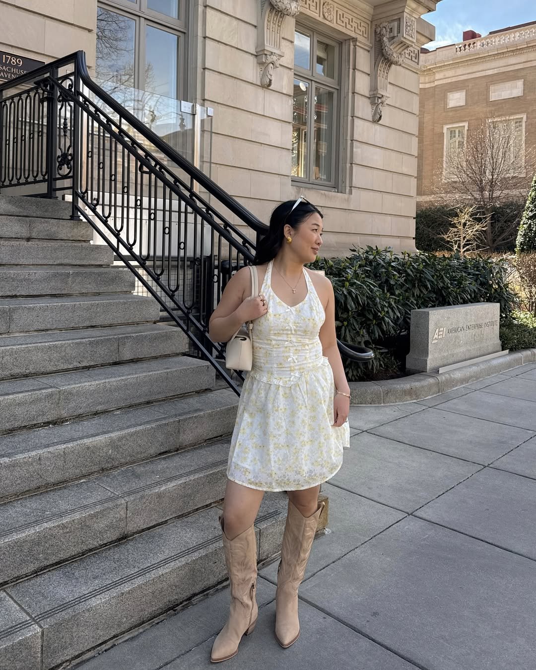 I love how the boots ground the sweetness of the dress. It’s the perfect balance of romantic and practical, like you could head from brunch straight to exploring the city without missing a beat.