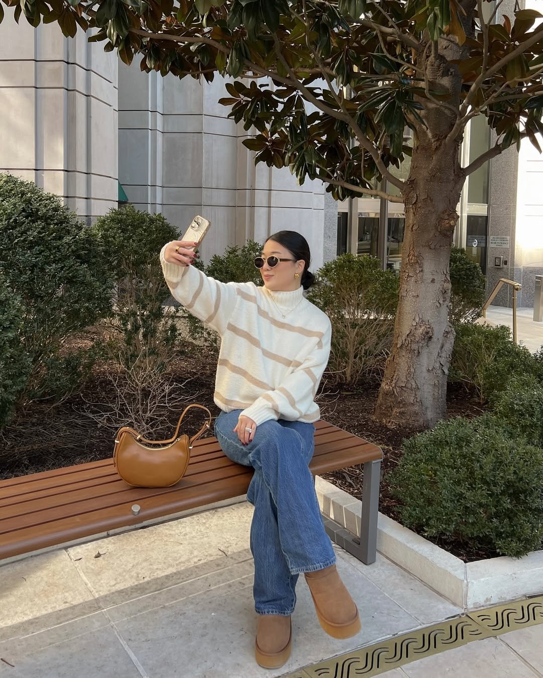 An oversized striped sweater tucked into relaxed straight-leg jeans feels cozy but styled. The warm beige stripes echo perfectly with the camel bag and platform boots, creating a soft, cohesive palette.