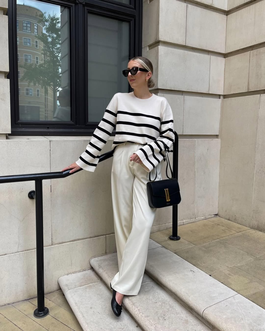 A classic striped sweater and flowing cream trousers is a forever combo. It’s simple, yes, but it never looks boring. The black crossbody and sleek loafers anchor the look so it doesn’t drift into overly sweet territory.