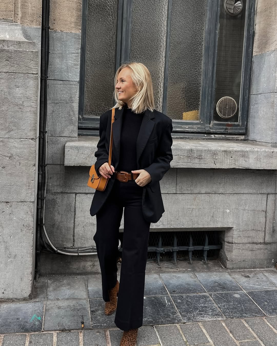 A full black outfit always looks sharp, but the warm brown accessories here bring it to life. The belt and bag soften the look just enough while keeping the monochrome base strong.