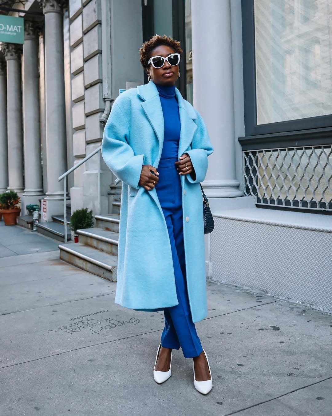 This outfit proves how powerful color can be when you commit to it fully. The deep blue set layered under a soft powder-blue coat creates a bold yet incredibly polished monochrome look.