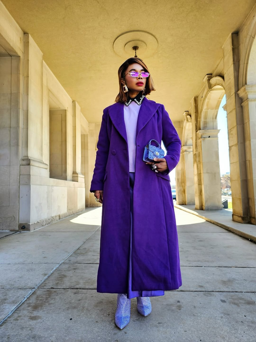 This is the kind of outfit that owns the room—or in this case, the entire hallway. The deep purple coat instantly grabs attention while still feeling elegant and structured.