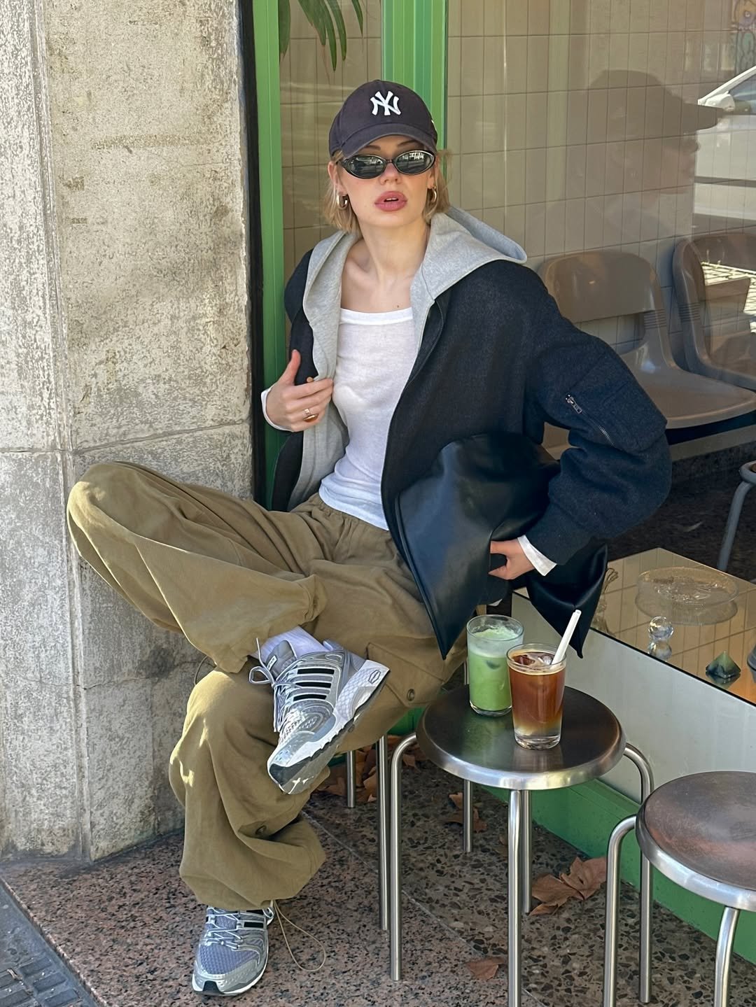 This look has that off-duty model vibe that fashion people love. The oversized jacket layered over a hoodie, paired with relaxed cargo pants and chunky sneakers, feels laid-back but still very intentional.