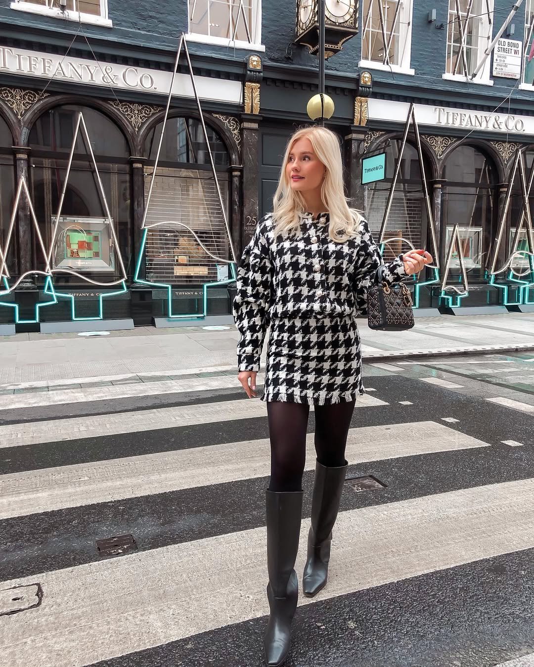 There’s something about black and white that instantly feels polished, and this look proves it. The houndstooth set paired with sleek knee-high boots feels very “city morning, coffee in hand, places to be.” Standing outside Tiffany & Co. only adds to the polished, almost editorial vibe.