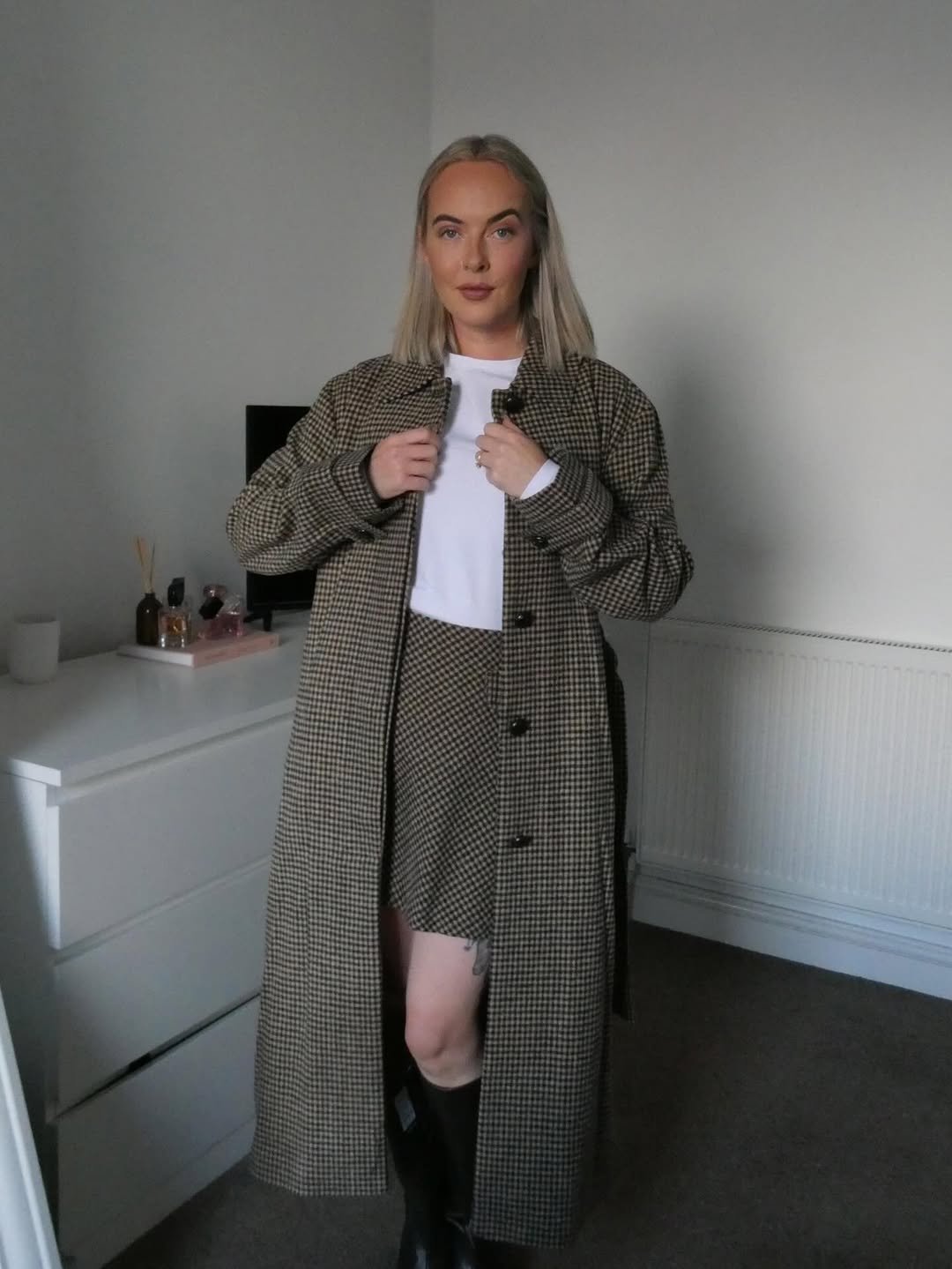 Matching sets just make life easier, and this checkered coat and skirt combo proves it. The neutral tones keep the outfit grounded while the pattern adds just enough interest.