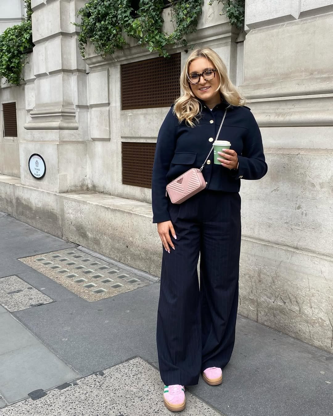 This outfit feels polished in the most approachable way. The navy set paired with soft pink accessories gives it a subtle contrast that’s playful without losing the sophisticated edge.