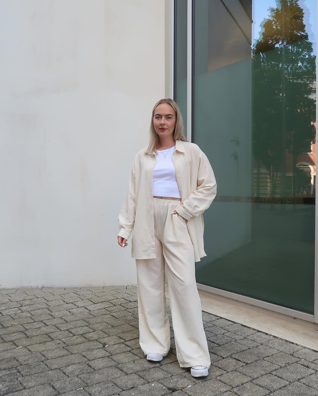 A cream monochrome outfit always feels fresh. The loose shirt layered over matching trousers gives this look a light, minimal feel that works beautifully with the neutral palette.